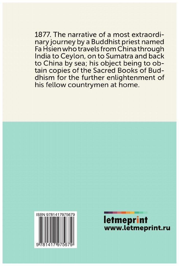 Эта книга - репринт оригинального издания (издательство "London : Tru? bner & Co. ; Shanghai : Kelly & Walsh", 1877 год), созданный на основе электронной копии высокого разрешения, которую очистили и обработали вручную, сохранив структуру и орфографию оригинального издания. Редкие, забытые и малоизвестные книги, изданные с петровских времен до наших дней, вновь доступны в виде печатных книг.1877. The narrative of a most extraordinary journey by a Buddhist priest named Fa Hsien who travels from China through India to Ceylon, on to Sumatra and back to China by sea; his object being to obtain copies of the Sacred Books of Buddhism for the further enlightenment of his fellow countrymen at home.Издательство Nobel PressМягкий переплетОбъем - 142 стр.Формат - 120x180 мм.ISBN 1417975679Год издания: 2010