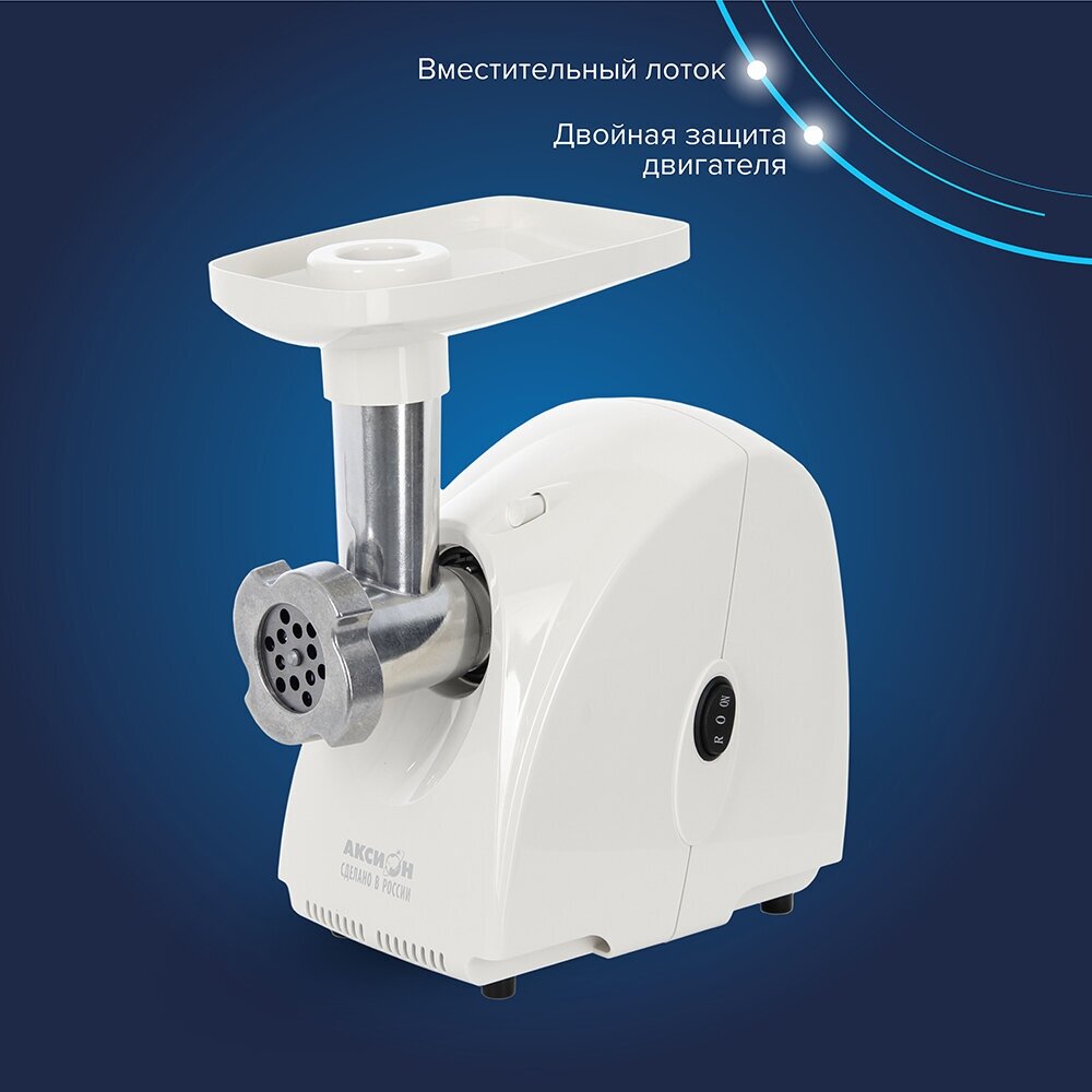 Электрическая мясорубка Аксион имеет функцию "реверс", позволяющую кратковременно поворачивать шнек в обратном направлении. В качестве емкости, в которую будет поступать фарш, можно использовать посуду, максимальная высота которой не превышает 11 см. Эргономичная конструкция агрегата предполагает наличие специального отсека для хранения решеток.