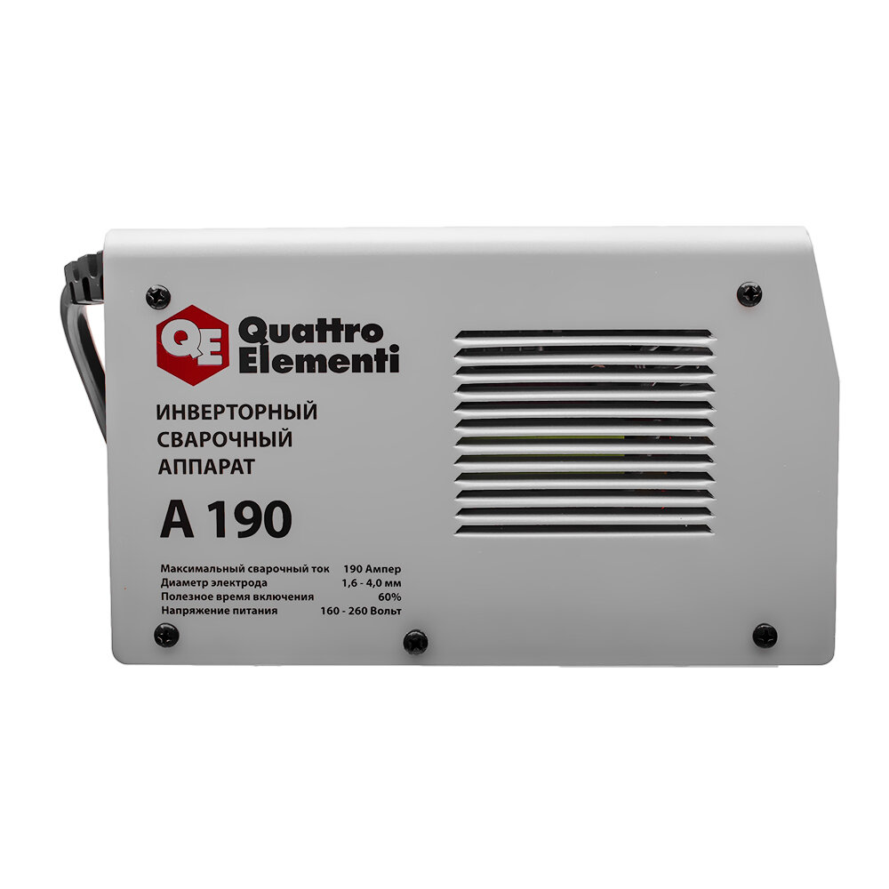 Сварочный аппарат Quattro Elementi A 190 – отличный выбор для сварки деталей из стали различных типов, чугуна и цветных металлов. Модель, применяемая для ручной дуговой сварки, характеризуется сочетанием приемлемой стоимости и высокого уровня технических характеристик. Максимальный сварочный ток аппарата равен 190 А. Quattro Elementi A 190 имеет защиту от перегрузки, оборудован удобным регулятором сварочного тока, и имеет функции антиприлипания электрода, горячего старта и форсажа дуги.
