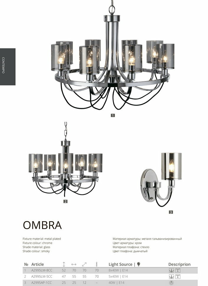 Бра для гостиной из коллекции Ombra. Степень защиты IP20. Площадь освещения 2 м2. Напряжение 220 В. Наличие выключателя.