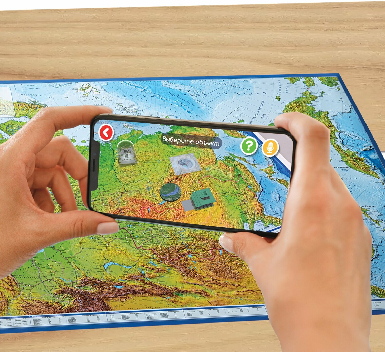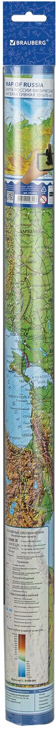 Откройте для себя удивительный мир географии с физической картой России BRAUBERG! Эта интерактивная карта России с ламинацией и масштабом 1:8,5М размером 101х70 см идеально подходит для комнаты подростка. Карта выполнена из ламинированной бумаги плотностью 170 г/м? и оснащена удобным европодвесом для легкого размещения на стене. На карте отображены названия рек и морей, городов и областей, гор и вулканов, что делает ее отличным инструментом для изучения географических особенностей России. Скачайте приложение IQ Globen на IOS или Android, выберите ""Карты"" и наведите камеру на карту, чтобы воспользоваться эффектом дополненной реальности. Любознательные помощники Ариша, Тема и Митя с четвероногими друзьями проведут вас по удивительным уголкам страны, познакомят с ее жителями, ландшафтом и достопримечательностями. Эта карта мира, особенно ее версия с подсветкой, станет незаменимым инструментом для тех, кто интересуется картами и глобусами. Превратите изучение географии в захватывающее приключение с географической картой России на стену, которая оживает на вашем экране!