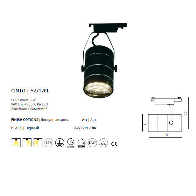 Трековый светильник однофазный 220V светодиодный - продукт известной компании Artelamp (Италия). Имеет максимальную мощность 12 Вт, освещает площадь до 2 кв. м. Впишется в интерьеры следующих стилей: техно.