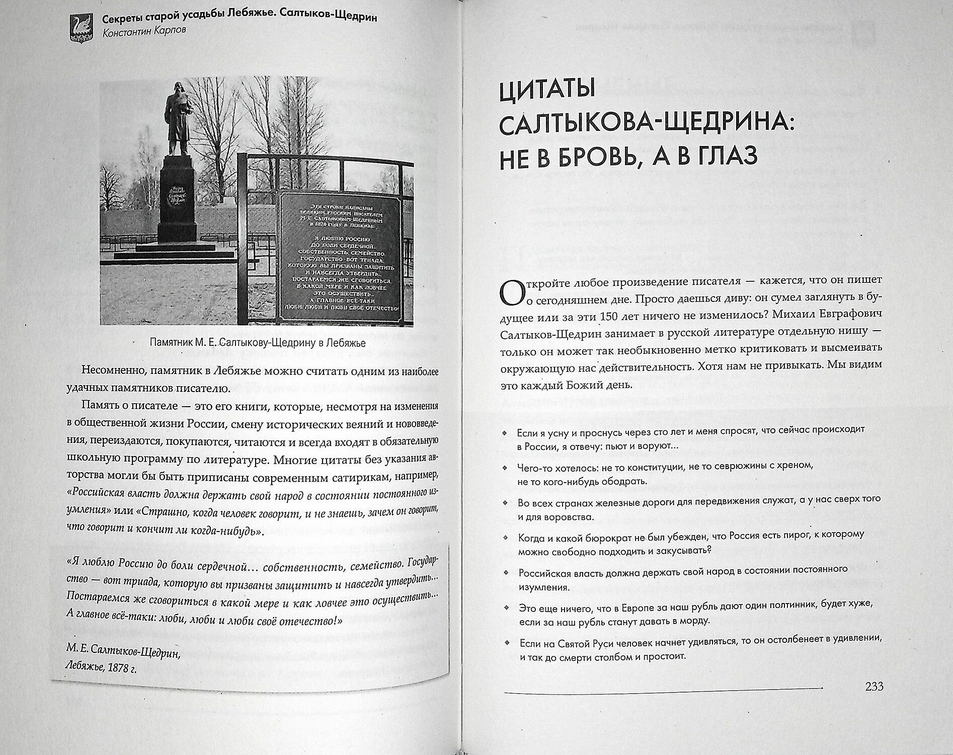 Книга в увлекательной форме рассказывает о неизвестных страницах истории посёлка Лебяжье в Ломоносовском районе Ленинградской области, связанных с жизнью и творчеством непревзойдённого русского писателя-сатирика Михаила Евграфовича Салтыкова-Щедрина, владевшего усадьбой в этих местах.