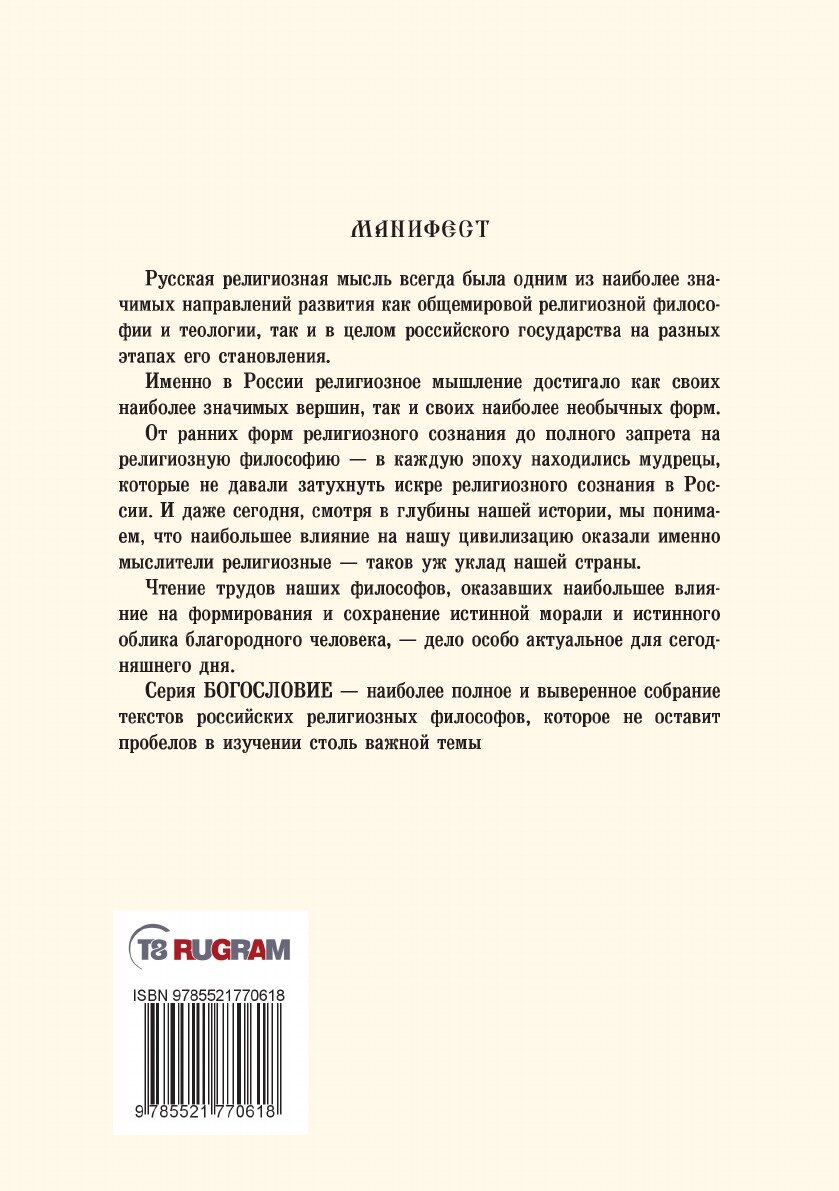 Русская религиозная мысль всегда была одним из наиболее значимых направлений развития как общемировой религиозной философии и теологии, так и в целом российского государства на разных этапах его становления. Именно в России религиозное мышление достигало как своих наиболее значимых вершин, так и своих наиболее необычных форм. От ранних форм религиозного сознания до полного запрета на религиозную философию - в каждую эпоху находились мудрецы, которые не давали затухнуть искре религиозного сознания в России. И даже сегодня, смотря в глубины нашей истории, мы понимаем, что наибольшее влияние на нашу цивилизацию оказали именно мыслители религиозные - таков уж уклад нашей страны. Чтение трудов наших философов, оказавших наибольшее влияние на формирования и сохранение истинной морали и истинного облика благородного человека, - дело особо актуальное для сегодняшнего дня. Серия богословие - наиболее полное и выверенное собрание текстов российских религиозных философов, которое не оставит пробелов в изучении столь важной темы.Издательство RUGRAMМягкий переплетОбъем - 436 стр.Формат - 148x210 мм.ISBN 978-5-521-77061-8Год издания: 2022