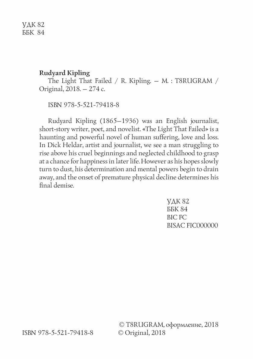 Rudyard Kipling (1865-1936) was an English journalist, short-story writer, poet, and novelist. "The Light That Failed" is a haunting and powerful novel of human suffering, love and loss. In Dick Heldar, artist and journalist, we see a man struggling to rise above his cruel beginnings and neglected childhood to grasp at a chance for happiness in later life. However as his hopes slowly turn to dust, his determination and mental powers begin to drain away, and the onset of premature physical decline determines his final demise.Издательство RUGRAMМягкий переплетОбъем - 274 стр.Формат - 148x210 мм.ISBN 978-5-521-79418-8Год издания: 2022