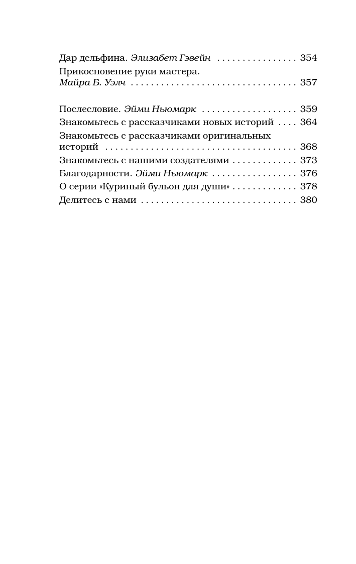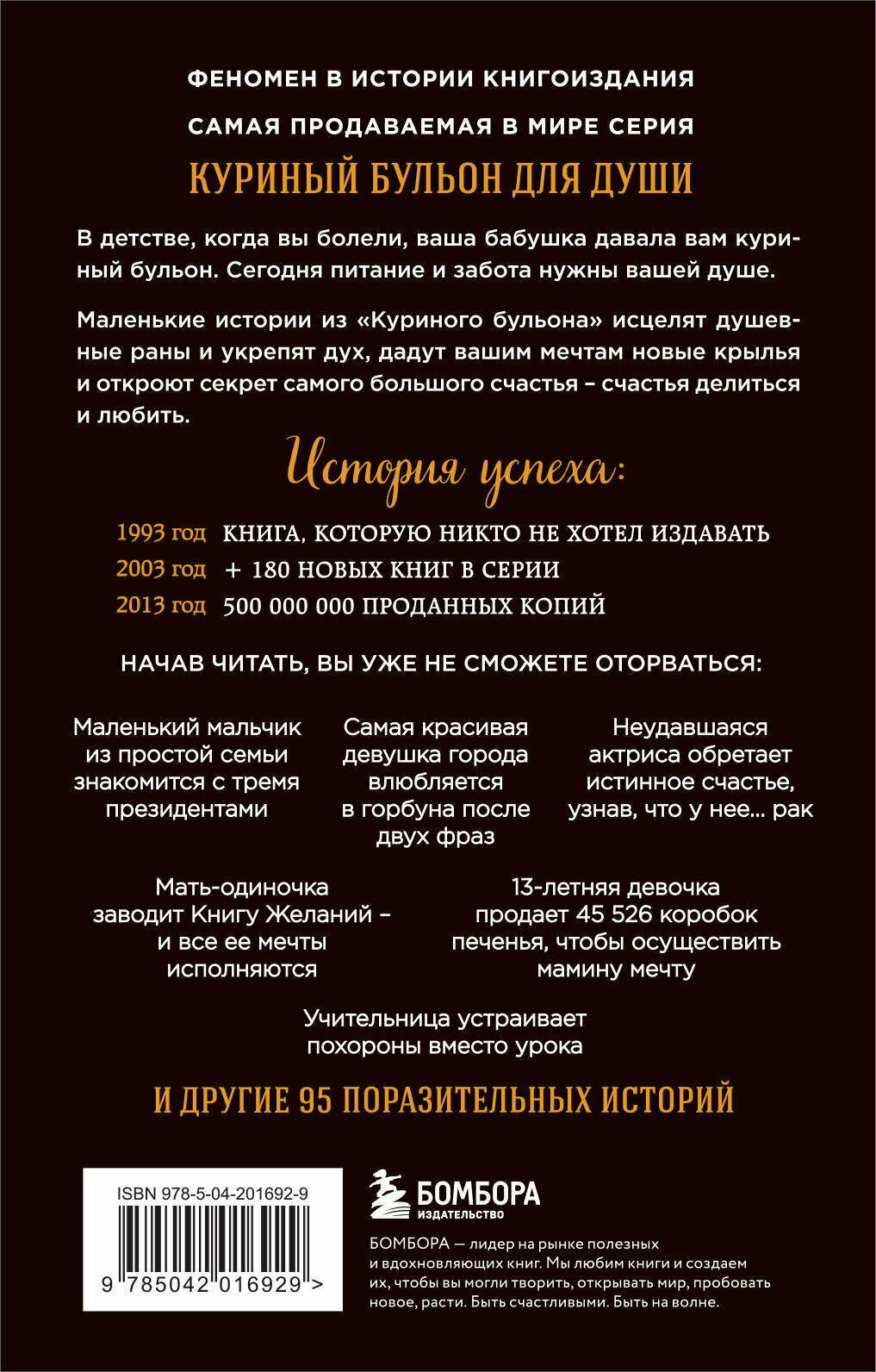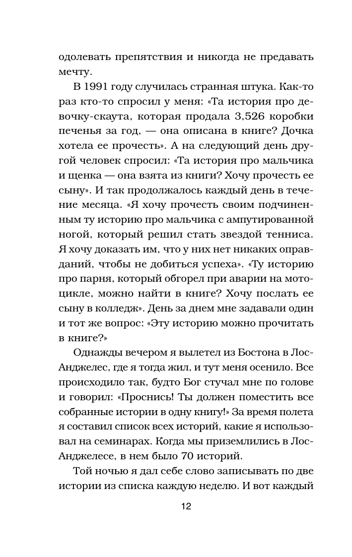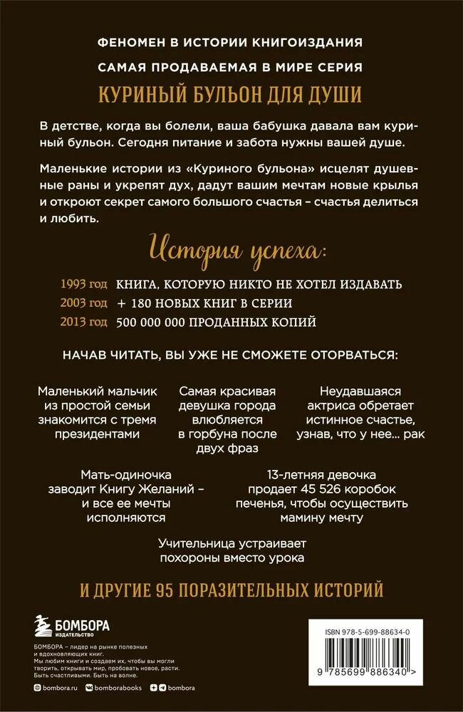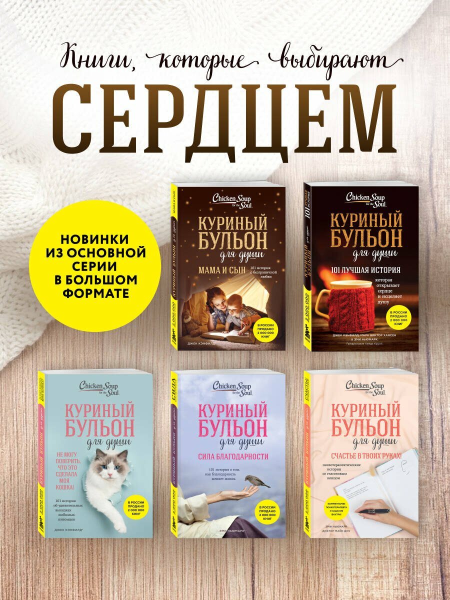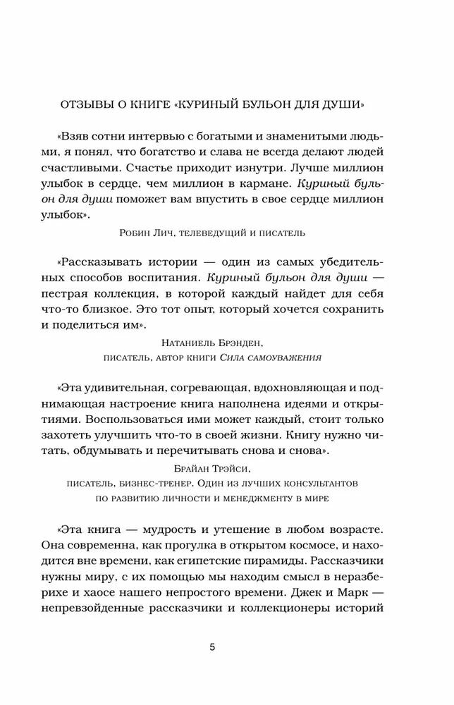 В детстве, когда вы болели, ваша бабушка давала вам куриный бульон. Сегодня питание и забота нужны вашей душе. Маленькие истории из «Куриного бульона» исцелят душевные раны и укрепят дух, дадут вашим мечтам новые крылья и откроют секрет самого большого счастья счастья делиться и любить. Маленький мальчик из простой семьи знакомится с тремя президентами. Мать-одиночка заводит Книгу Желаний и все ее мечты исполняются. Неудавшаяся актриса обретает истинное счастье, узнав что у нее... рак. Самая красивая девушка города влюбляется в горбуна после двух фраз. Учительница устраивает похороны вместо урока. 13-летняя девочка продает 45 526 коробки печенья, чтобы осуществить мамину мечту. И другие 95 поразительных историй, от которых вы не сможете оторваться.