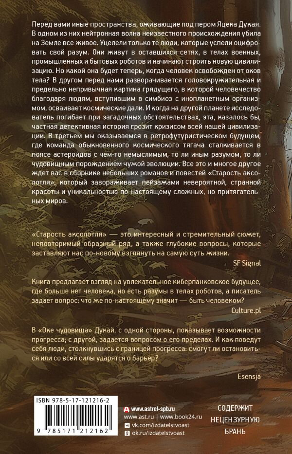 Перед вами иные пространства, оживающие под пером Яцека Дукая. В одном из них нейтронная волна неизвестного происхождения убила на Земле все живое. Уцелели только те люди, которые успели оцифровать свой разум. Они живут в оставшихся сетях, в телах военных, промышленных и бытовых роботов и начинают строить новую цивилизацию. Но какой она будет теперь, когда человек освобожден от оков тела? В другом перед нами разворачивается головокружительная и предельно непривычная картина грядущего, в которой человечество благодаря людям, вступившим в симбиоз с инопланетным организмом, осваивает космические дали. И когда на другой планете исследователь погибает при загадочных обстоятельствах, эта, казалось бы, частная детективная история грозит кризисом всей нашей цивилизации. В третьем мы оказываемся в ретрофутуристическом будущем, где команда обыкновенного космического тягача сталкивается в поясе астероидов с чем-то немыслимым, то ли иным разумом, то ли чудовищным порождением чужой эволюции. Все это и многое другое ждет вас в сборнике небольших романов и повестей "Старость аксолотля", который завораживает пейзажами невероятной, странной красоты и уникальностью по-настоящему сложных, но притягательных миров.
