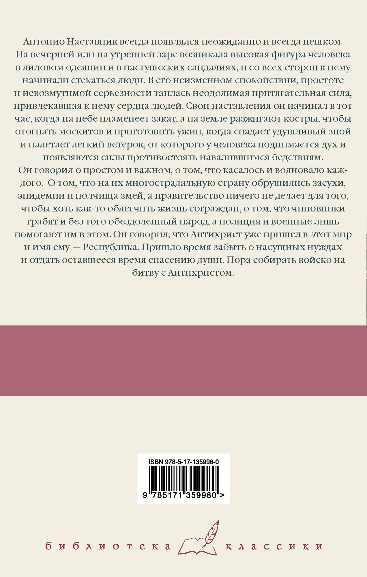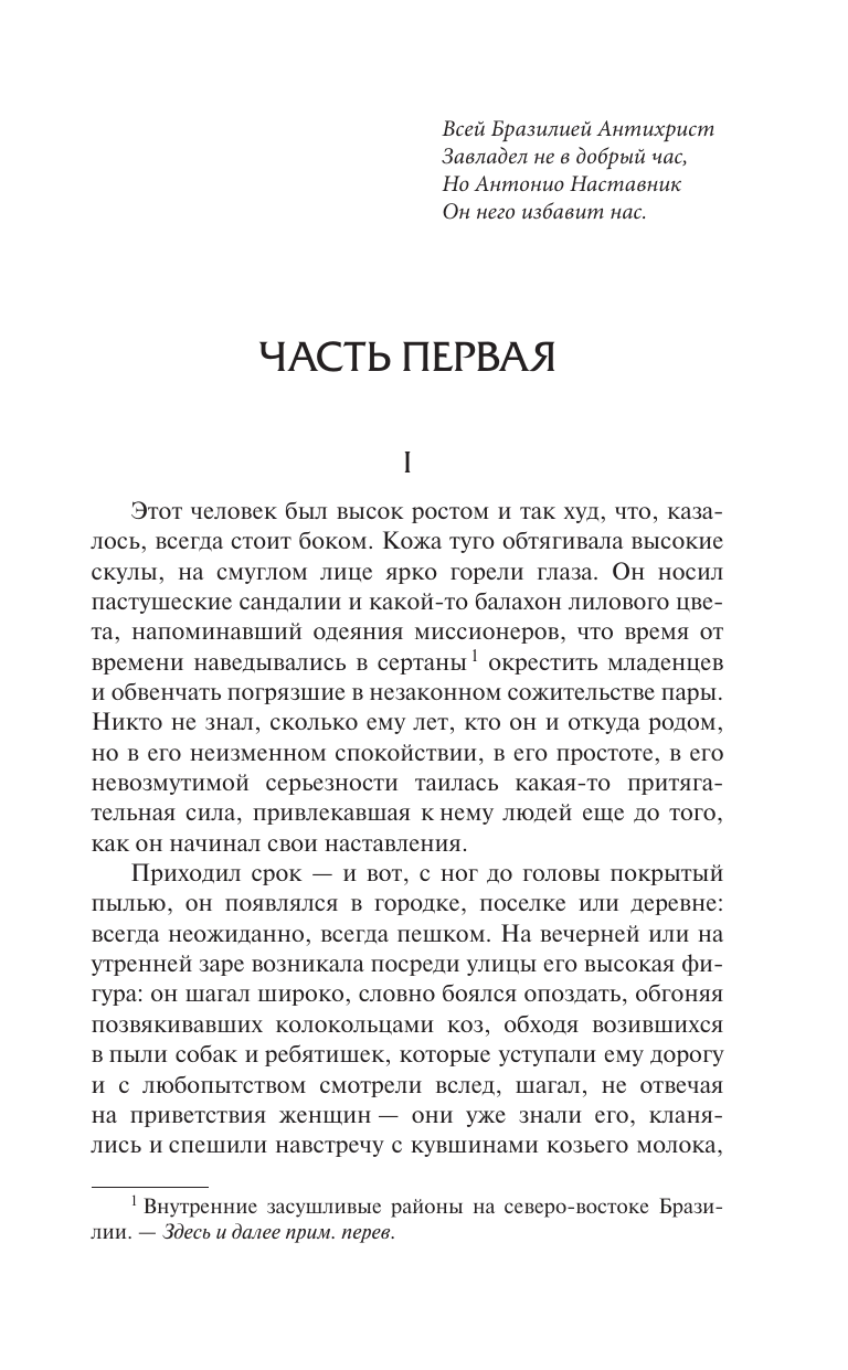 Антонио Наставник всегда появлялся неожиданно и всегда пешком. На вечерней или на утренней заре возникала высокая фигура человека в лиловом одеянии и в пастушеских сандалиях, и со всех сторон к нему начинали стекаться люди. В его неизменном спокойствии, простоте и невозмутимой серьезности таилась неодолимая притягательная сила, привлекавшая к нему сердца людей. Свои наставления он начинал в тот час, когда на небе пламенеет закат, а на земле разжигают костры, чтобы отогнать москитов и приготовить ужин, когда спадает удушливый зной и налетает легкий ветерок, от которого у человека поднимается дух и появляются силы противостоять навалившимся бедствиям.