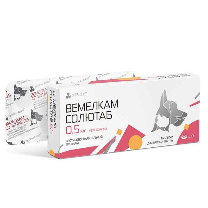 Вемелкам Солютаб - это ветеринарный препарат, предназначенный для собак и кошек. Он выпускается в форме таблеток, которые легко принимать внутрь. В одной упаковке содержится 10 таблеток. Препарат обладает противовоспалительным и обезболивающим действием, благодаря входящему в его состав мелоксикаму. Механизм действия основан на способности ингибировать выработку циклооксигеназы в цикле арахидоновой кислоты, подавляя преимущественно циклооксигеназу-II, под влиянием которой происходит синтез воспалительных простагландинов, вызывающих воспаления, отек и боль. Вемелкам Солютаб предназначен для применения при воспалительных и болевых синдромах различного происхождения, включая острые и хронические заболевания опорно-двигательного аппарата, воспалительные заболевания мягких тканей и послеоперационный период. Препарат следует применять с осторожностью, так как он имеет ряд противопоказаний. Не следует применять беременным и лактирующим самкам, щенкам и котятам моложе 6-недельного возраста, а также продуктивным животным. При применении Вемелкам Солютаб возможны побочные эффекты, такие как потеря аппетита, рвота и диарея. Однако эти симптомы обычно исчезают после отмены препарата. Вемелкам Солютаб отпускается без рецепта, но при работе с ним следует соблюдать общие правила личной гигиены и техники безопасности. Людям с гиперчувствительностью к компонентам препарата следует избегать прямого контакта с ним. Вемелкам Солютаб произведен в России и имеет регистрационный номер 44-3-28.23-5076№ПВР-3-28.23/03890 от 28 декабря 2023 года.