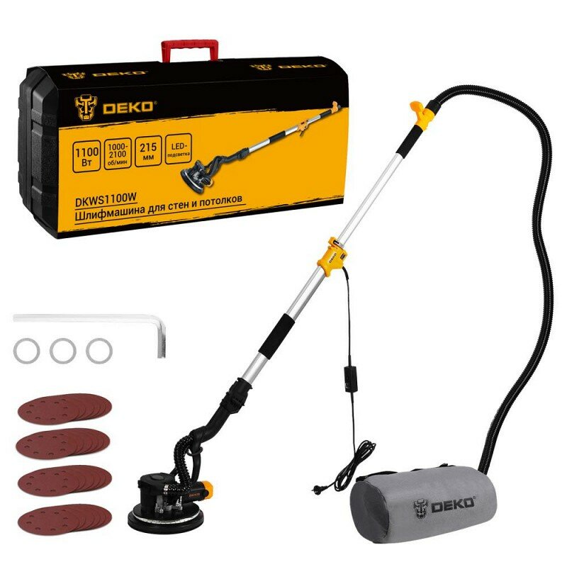 **Машина шлифовальная Deko DKWS1100** используется во время строительных и ремонтных работ. Предназначена для шлифования и полирования гипсовых и гипсокартонных стен и потолков. Устройство качественно обрабатывает поверхность. Чтобы в процессе работы в помещении образовывалось меньше пыли, шлифовальная машина совместима с пылесосом.