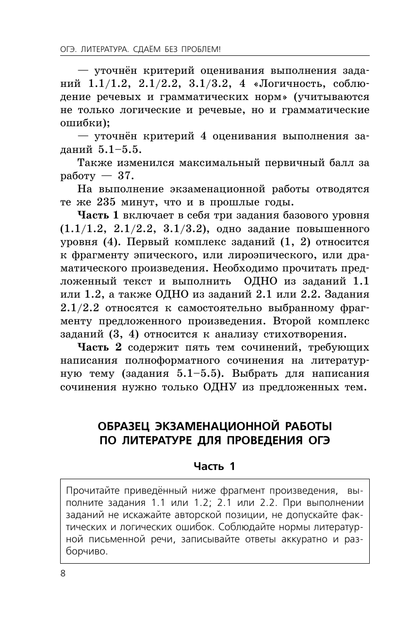 В пособии представлены все необходимые материалы для подготовки учащихся 9-х классов к ОГЭ по литературе: описание структуры экзаменационной работы, алгоритмы выполнения заданий всех типов, примеры работ с комментариями к их оцениванию, а также 10 тренировочных вариантов, составленных в соответствии с демо-версией. Кроме того, издание содержит справочные материалы теоретико-литературного характера.