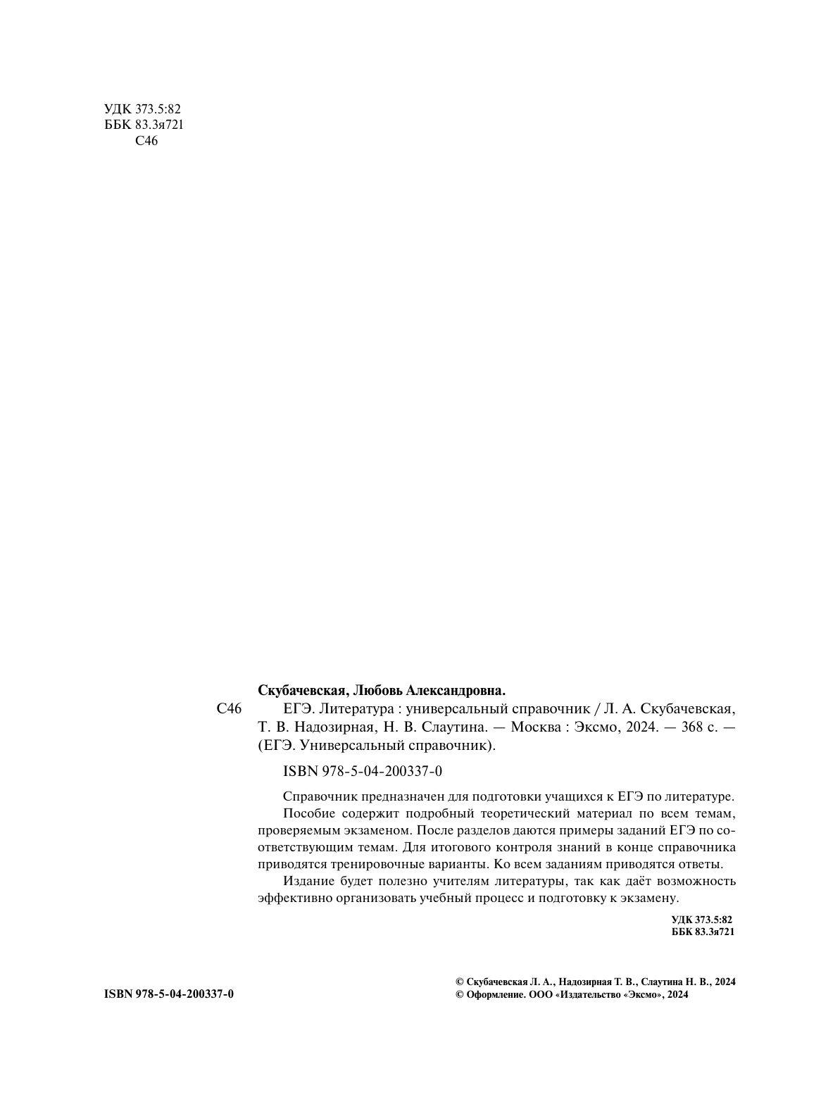 ЕГЭ. Литература. Универсальный справочник (Любовь Александровна Скубачевская, Наталия Владимировна Слаутина, Татьяна Владимировна Надозирная); Эксмо, 2024