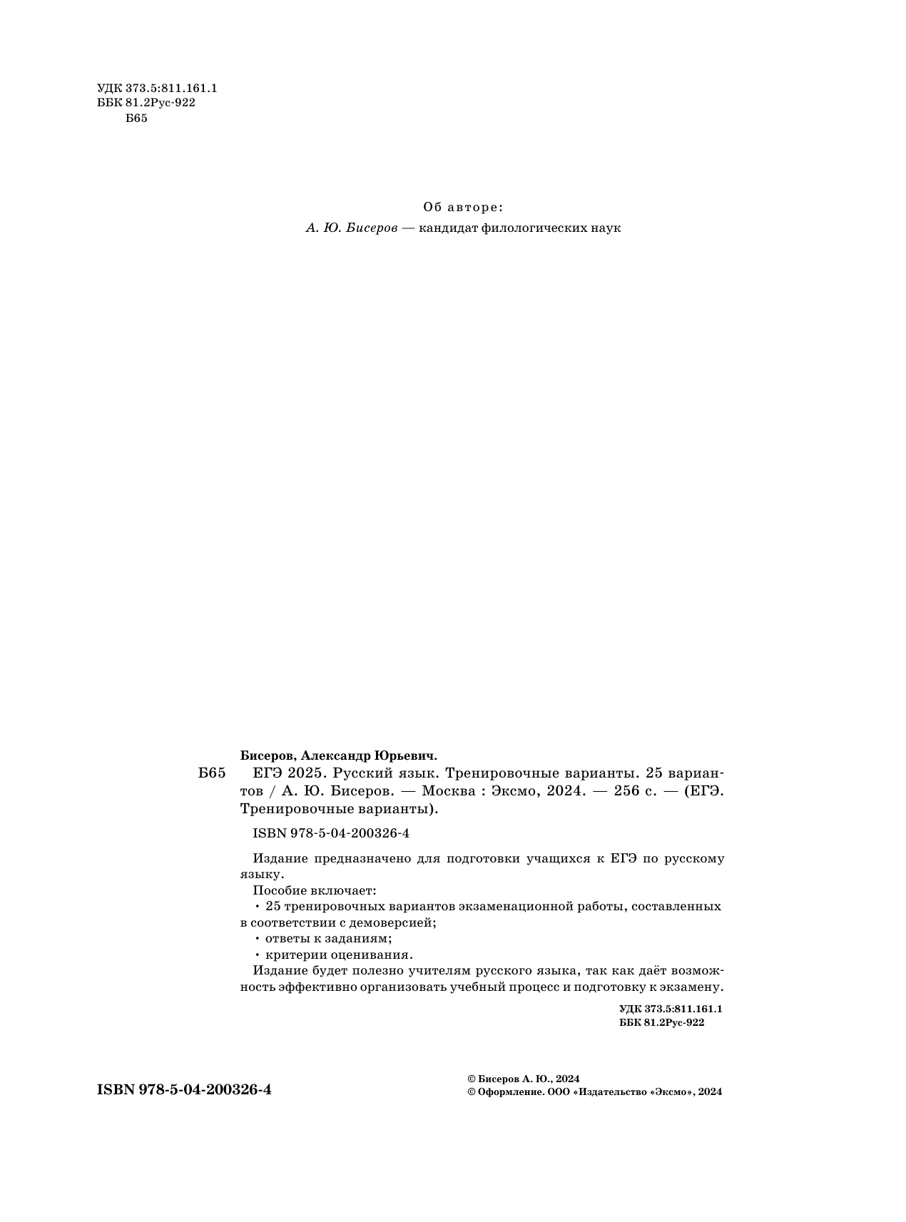ЕГЭ-2025. Русский язык. Тренировочные варианты. 25 вариантов (Александр Юрьевич Бисеров); Эксмо, 2024