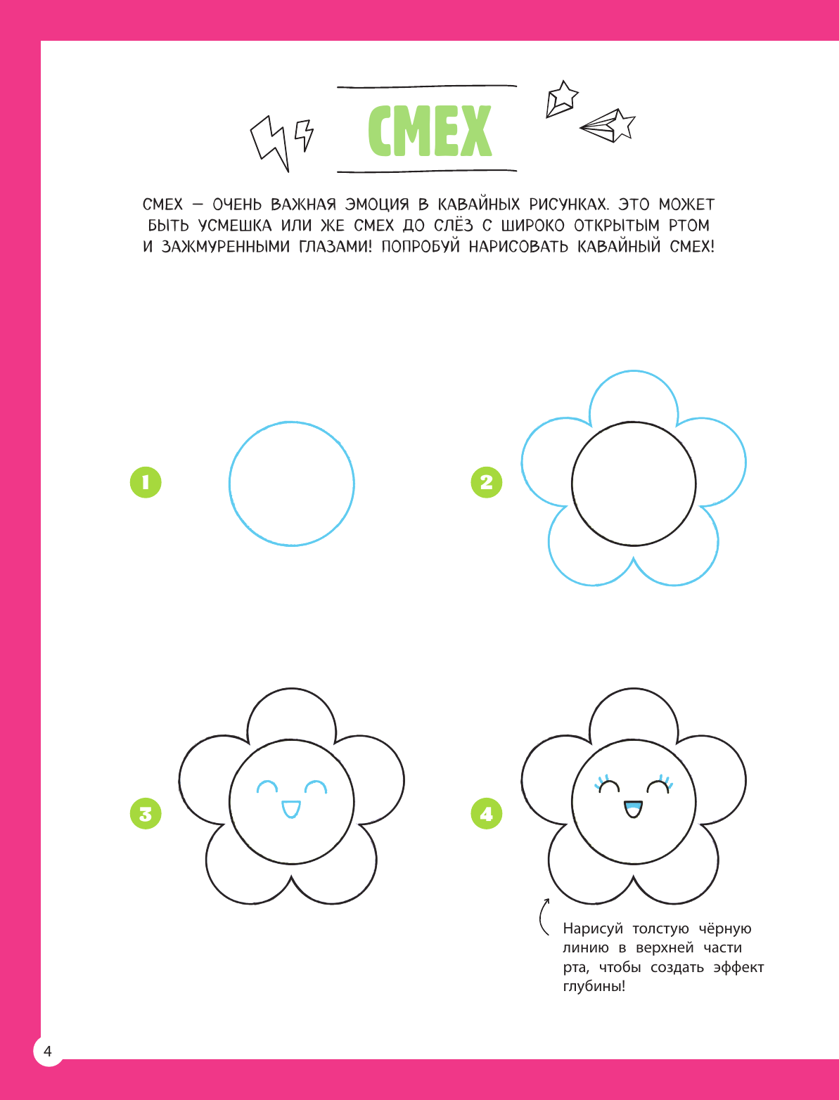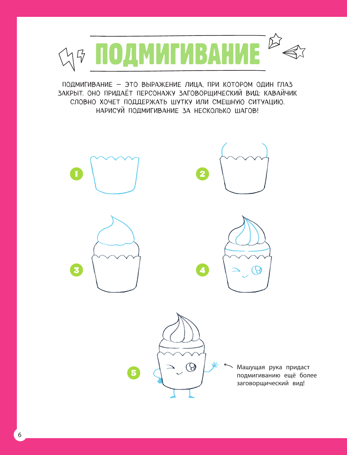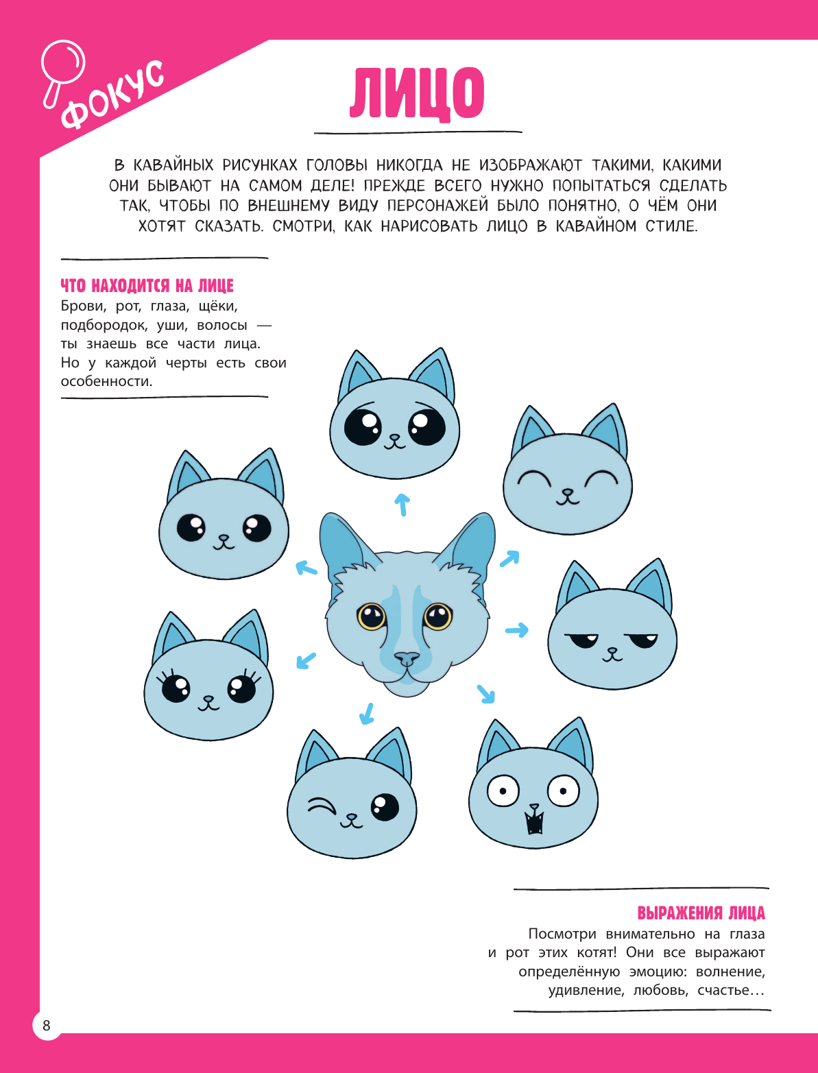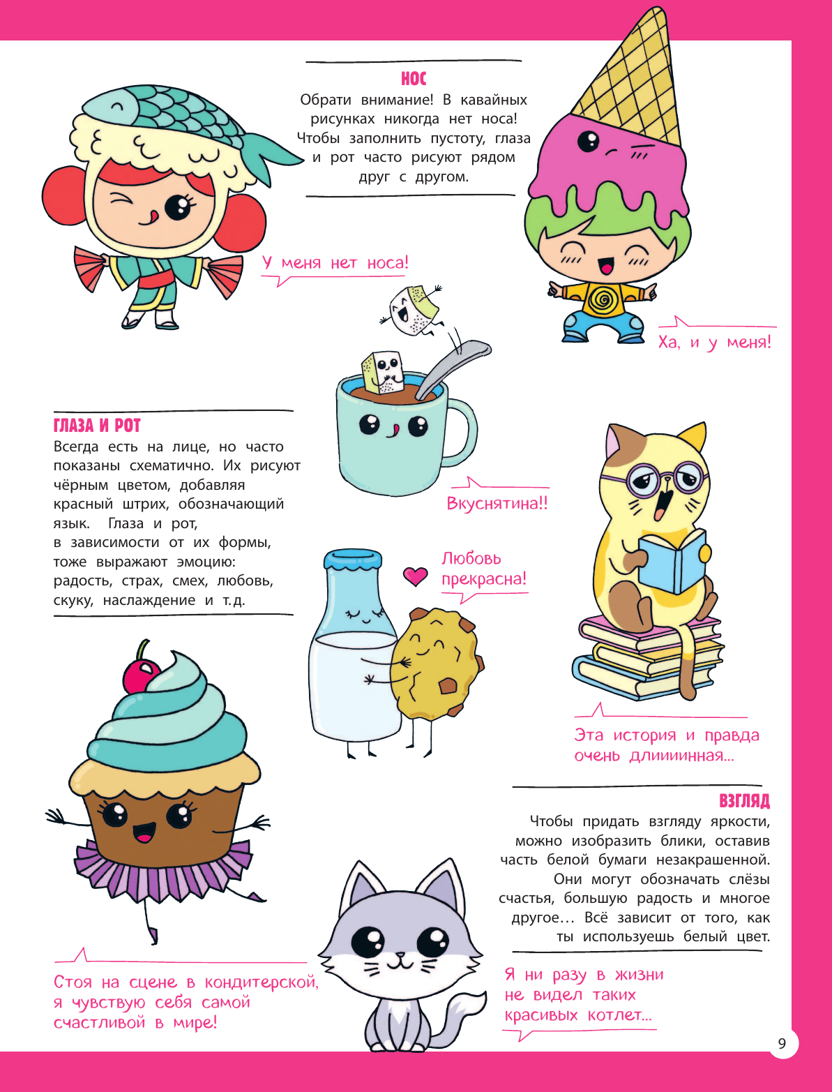 Тренируйся и улучшай свою технику, чтобы научиться рисовать самые милые рисунки! - Более 30 пошаговых схем, начинающихся с самых простых элементов: ты можешь отталкиваться от уже нарисованных фигур. - Примеры рисунков и советы, которые помогут тебе понять особенности стиля kawaii. - Закончив уроки в книге, ты можешь повторить рисунки там, где тебе хочется!
