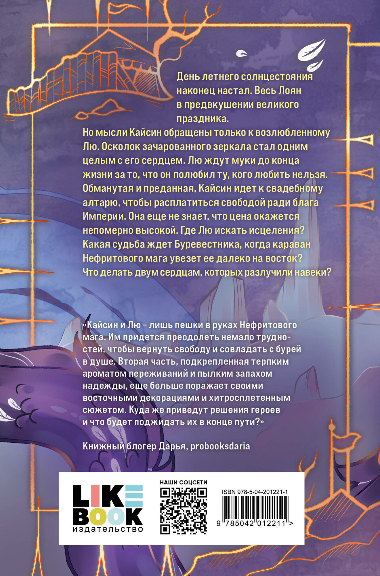 День летнего солнцестояния наконец настал. Весь Лоян в предвкушении великого праздника. Но мысли Кайсин обращены только к возлюбленному Лю. Осколок зачарованного зеркала стал одним целым с его сердцем. Лю ждут муки до конца жизни за то, что он полюбил ту, кого любить нельзя. Обманутая и преданная, Кайсин идет к свадебному алтарю, чтобы расплатиться свободой ради блага Империи. Она еще не знает, что цена окажется непомерно высокой. Где Лю искать исцеление? Какая судьба ждет Буревестника, когда караван Нефритового мага увезет ее далеко на Восток? Что делать двум сердцам, которых разлучили навеки?