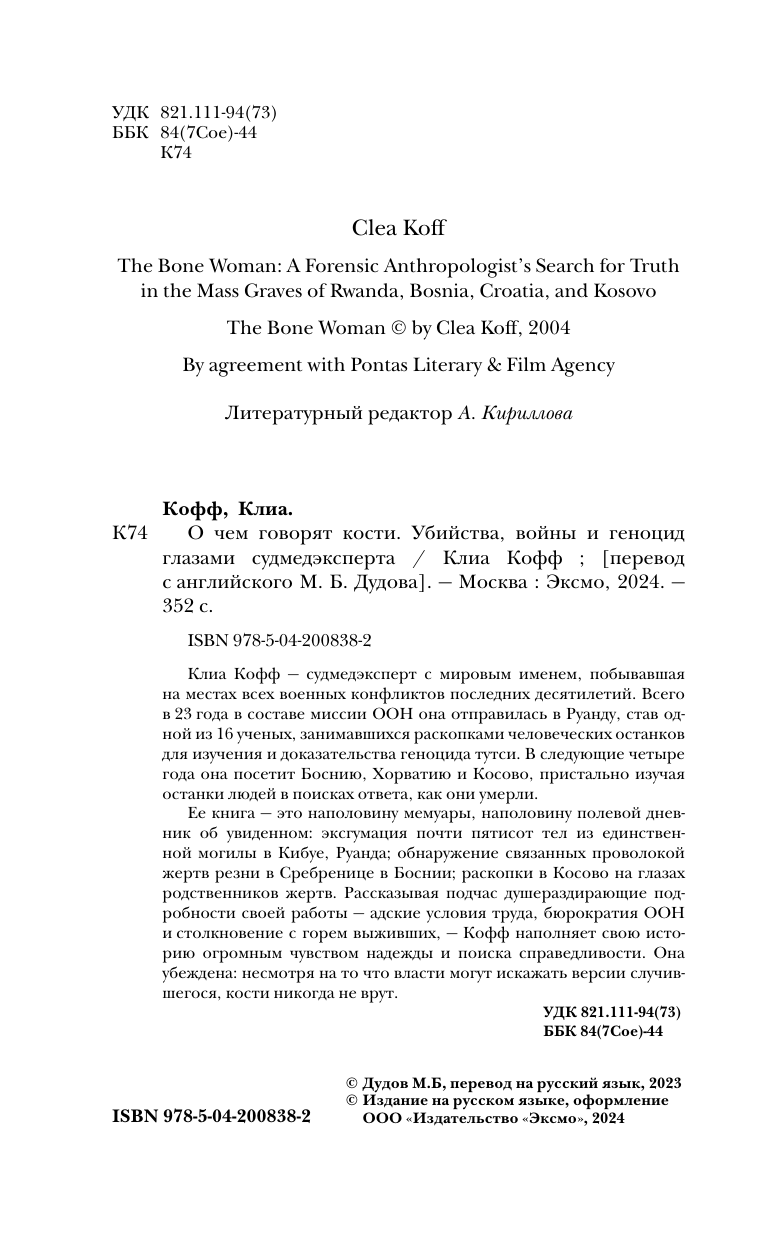О чем говорят кости. Убийства войны и геноцид глазами судмедэксперта (Кофф К.); ООО "Издательство "Эксмо", 2024