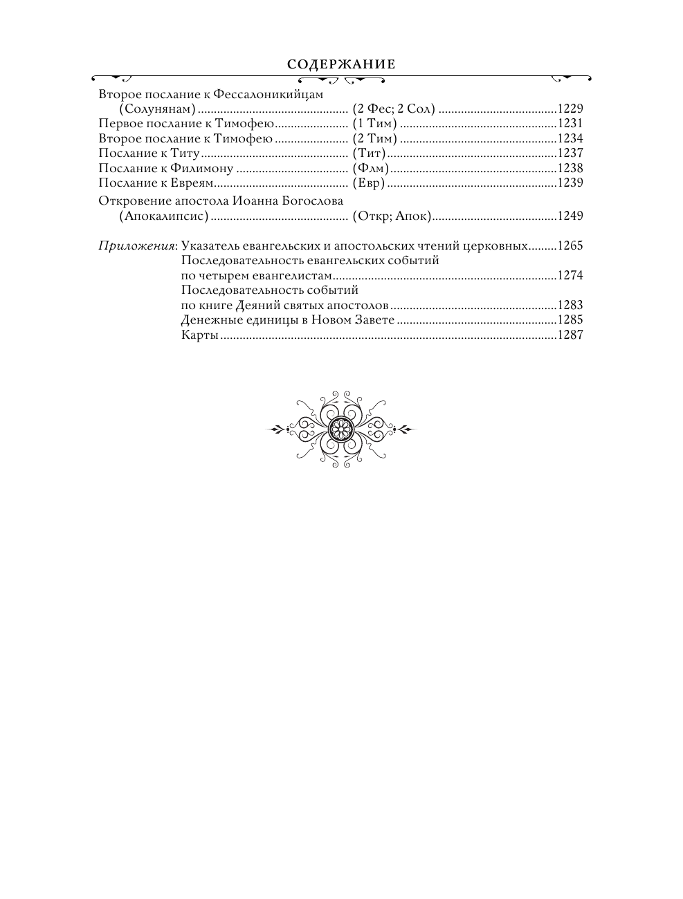 Полная Библия в русском Синодальном переводе. 50 книг Ветхого Завета и 27 книг Нового Завета. С указателем евангельских и апостольских церковных чтений, последовательностью евангельских событий по четырем евангелистам, последовательностью событий по книге Деяний святых апостолов, картами и другими приложениями. Перевод имеет высокий авторитет и широко используется не только в православной Церкви, но и в других христианских конфессиях, использующих русский язык для проповеди. Эксклюзивное оформление.