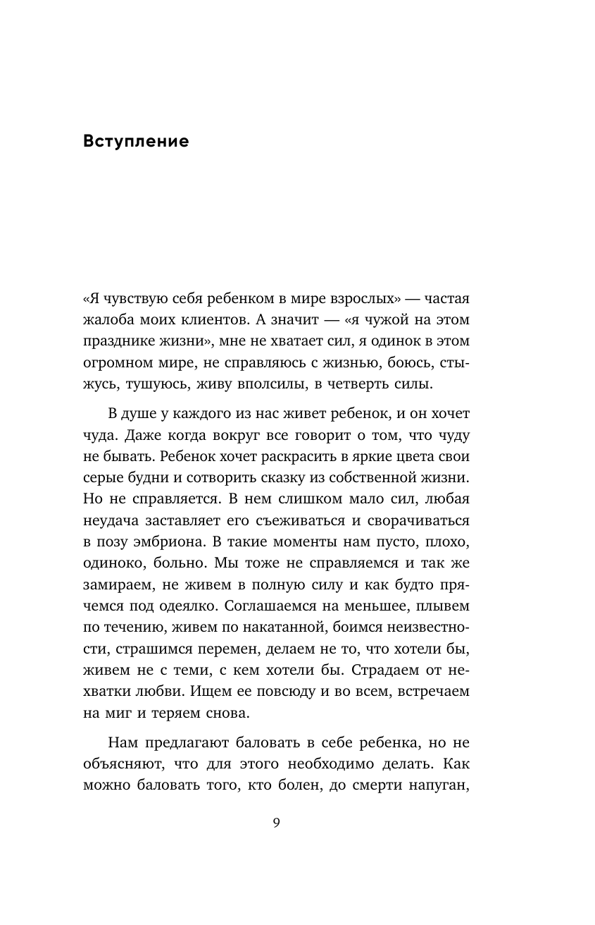 Психотерапевт Вера Дейногалериан утверждает: «Пока наш внутренний ребенок обижен, недолюблен и напуган, его бесполезно баловать, — его нужно спасать». В этой книге Вера предлагает нам изучить язык бессознательного, чтобы встретиться лицом к лицу со своей болью и исцелить ее. Здесь не будет медитаций, волшебства и аффирмаций. Только практичные инструменты, благодаря которым сотни клиентов обрели психологическую зрелость и наконец стали хозяевами своей жизни.
