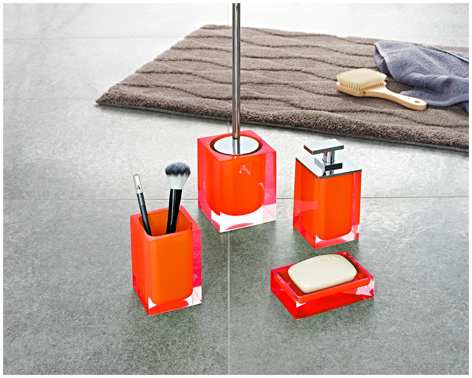 В данной коллекции представлены три цвета: синий, зеленый, оранжевый. Необычный воздушный дизайн: прозрачный снаружи, цветной внутри. Используются элементы из стали. Изделия серии Colours (стаканчик, мыльница, ершик, дозатор) устойчивы к ультрафиолету и мытью в посудомоечной машине, т.к. изготавливаются из добротной полирезины.
