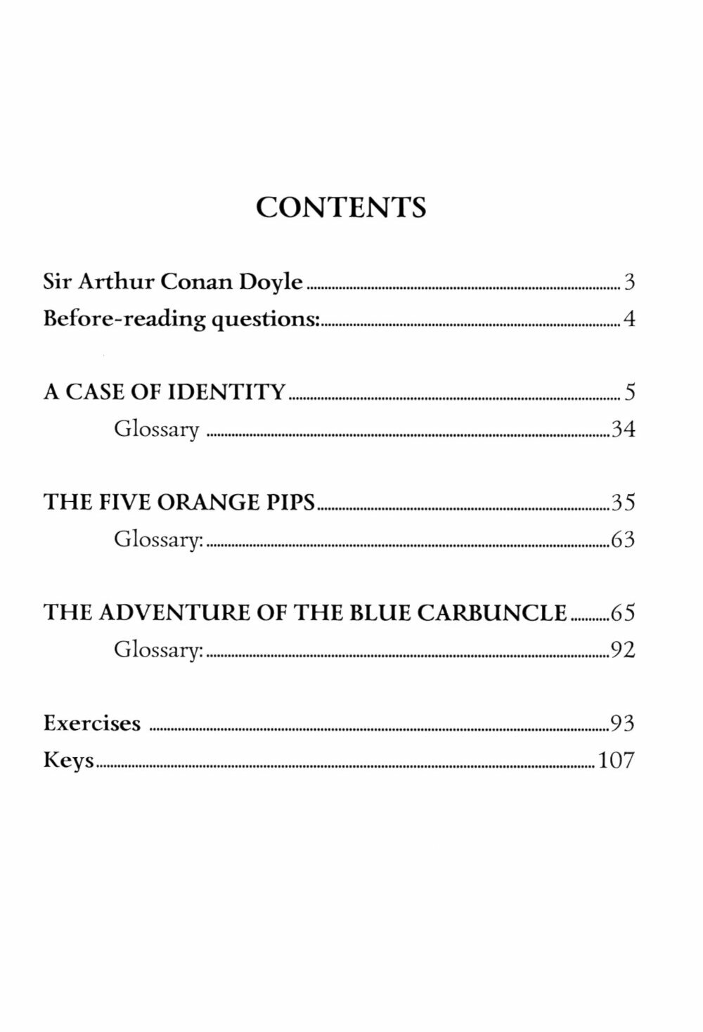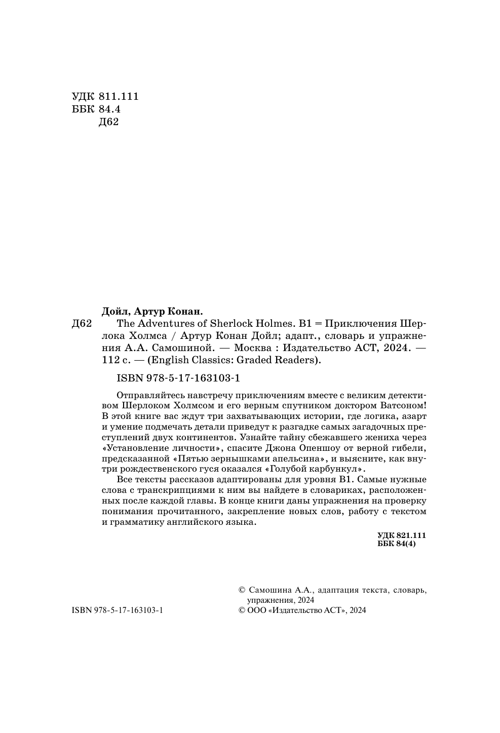 Отправляйтесь навстречу приключениям вместе с великим детективом Шерлоком Холмсом и его верным спутником доктором Ватсоном! В этой книге вас ждут три захватывающих истории, где логика, азарт и умение подмечать детали приведут к разгадке самых загадочных преступлений двух континентов. Узнайте тайну сбежавшего жениха через "Установление личности", спасите Джона Опеншоу от верной гибели, предсказанной "Пятью зернышками апельсина", и выясните, как внутри рождественского гуся оказался "Голубой карбункул".