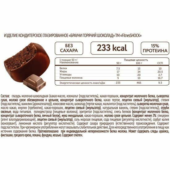 | Состав | Глазурь молочно-шоколадная (какао-масло, изомальт (подсластитель), какао порошок, концентрат молочного белка, сыворотка сухая, молоко сухое обезжиренное и цельное, концентрат сывороточного белка, какао тертое, лецитин соевый (эмульгатор), стевия (подсластитель), ванилин (ароматизатор)), кокосовое масло, шоколад (тертое какао, мальтитол (подсластитель), сыворотка молочная сухая, масло какао, инулин (пребиотик), какао порошок, лецитин соевый (эмульгатор), натуральная ваниль, стевия (подсластитель)), отруби овсяные, вода питьевая, полидекстроза (пищевые волокна), эритритол (подсластитель), смесь белков (концентрат молочного белка, концентрат сывороточного белка, яичный белок), мука миндальная, какао-порошок, молоко сухое цельное. |