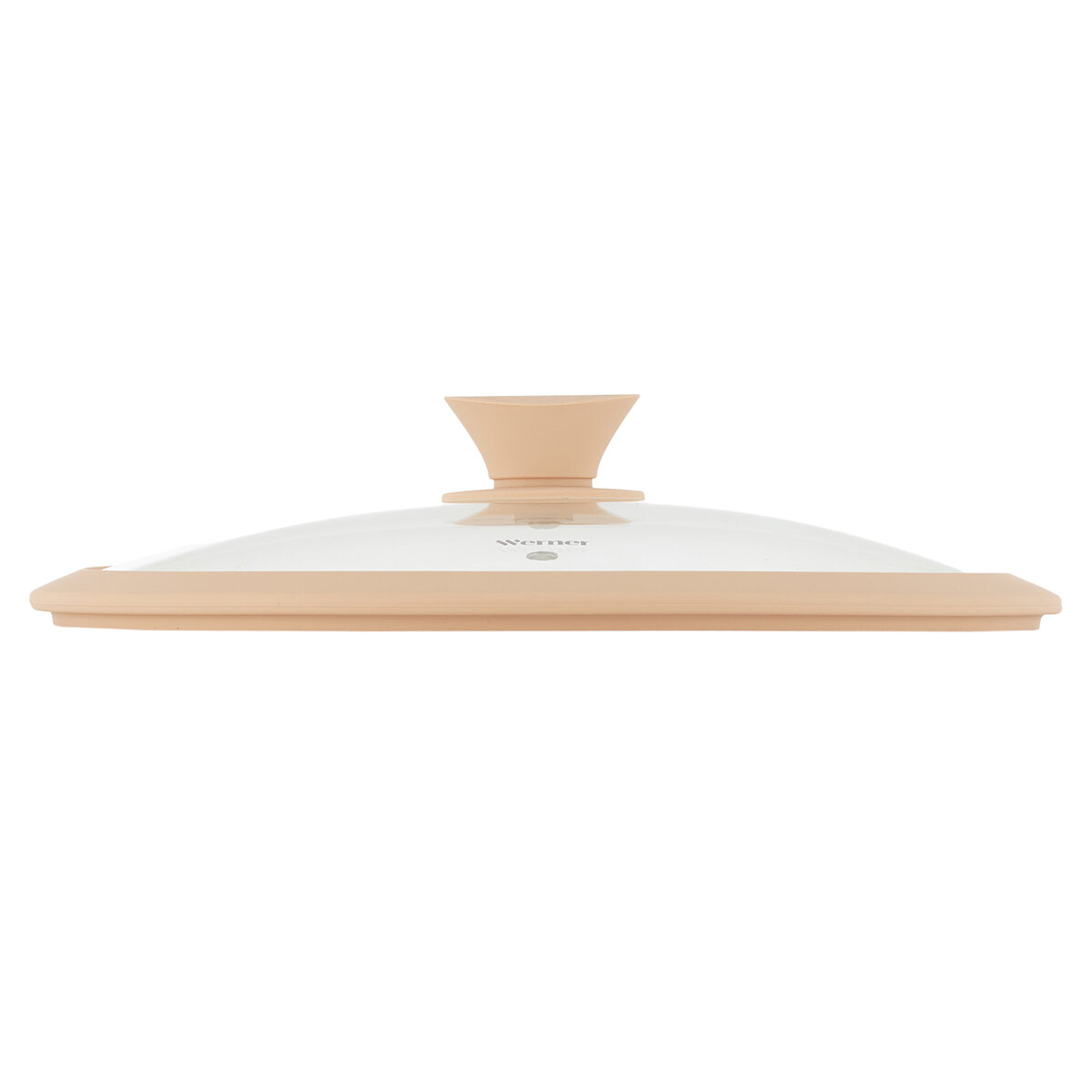 Крышка изготовлена из жаропрочного стекла с силиконовым ободом и не нагревающейся силиконовой ручкой бежевого цвета.