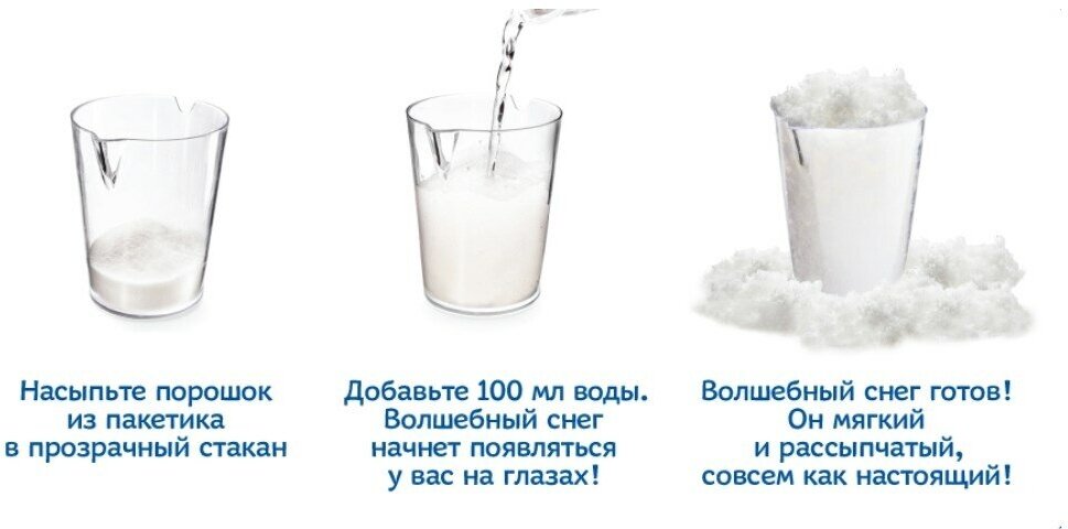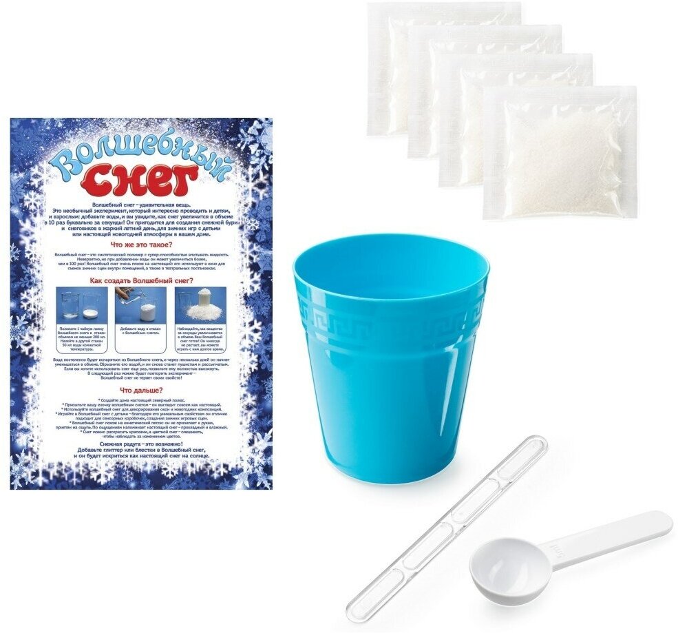 В наборе: снег 40г, пластиковый стакан, мерная ложка, палочка для размешивания, цветная инструкция.