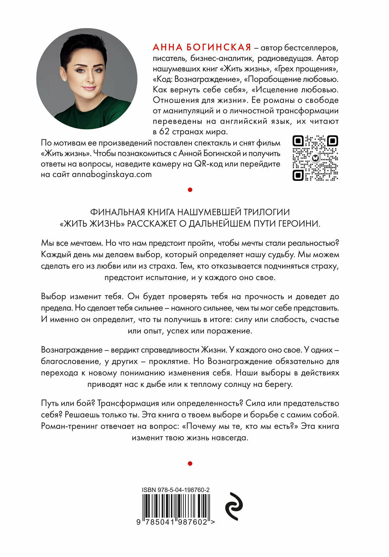 Анна Богинская — автор бестселлеров, писатель, бизнес-аналитик, радиоведущая. Автор нашумевших книг «Жить Жизнь», «Грех прощения», «Код: Вознаграждение», «Порабощение любовью. Как вернуть себе себя», «Исцеление любовью. Отношения для жизни». Ее романы о свободе от манипуляции и о личностной трансформации переведены на английский язык и читают в 62 странах мира. По мотивам ее произведений поставлен спектакль и снят фильм «Жить Жизнь».
