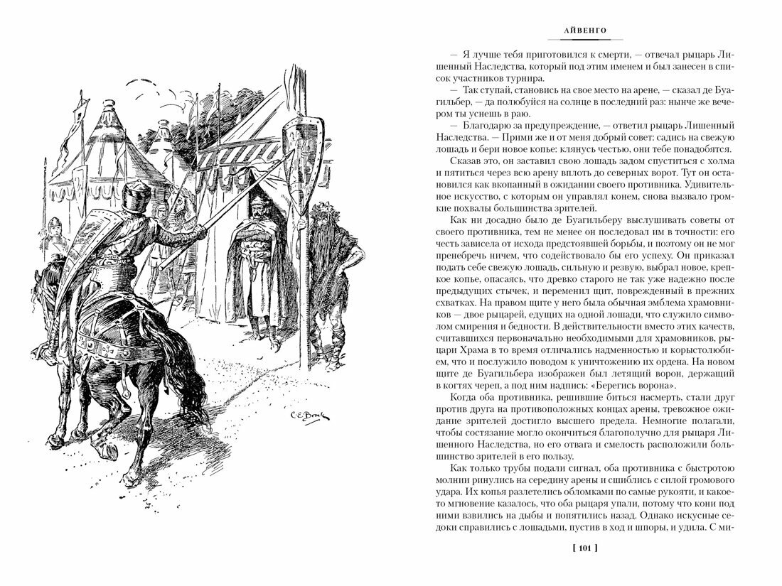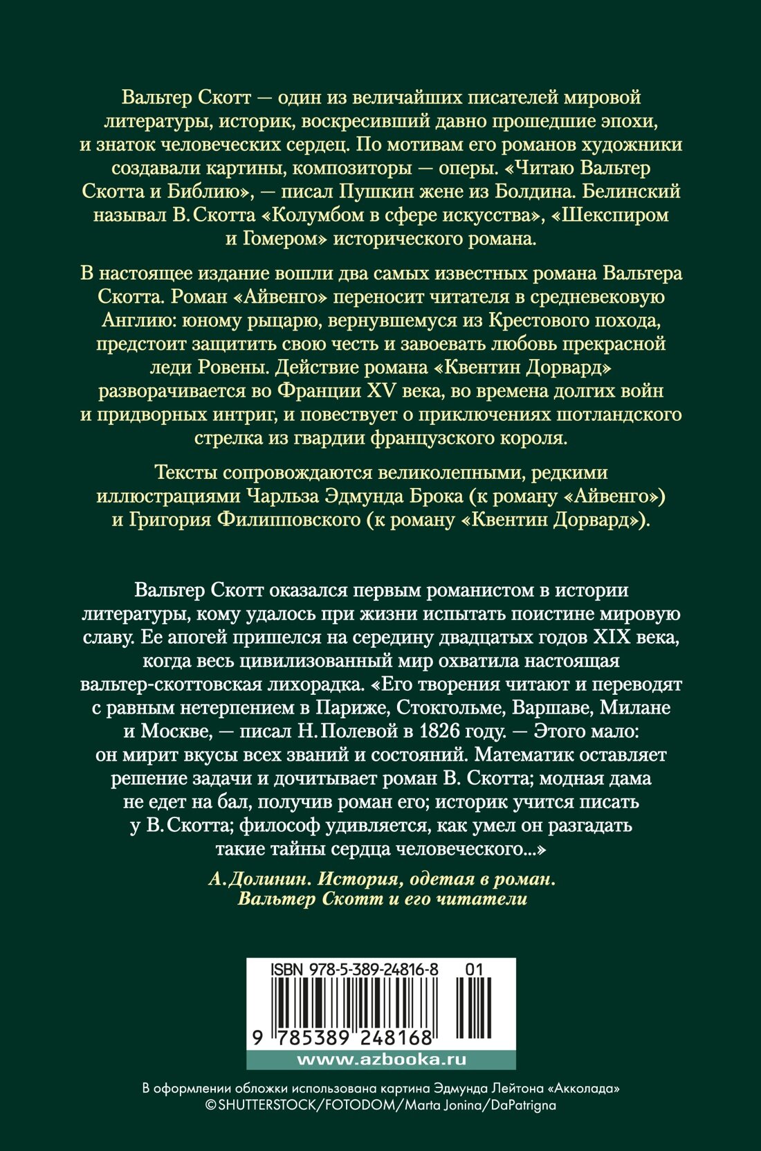 Вальтер Скотт — один из величайших писателей мировой литературы, историк, воскресивший давно прошедшие эпохи, и знаток человеческих сердец. По мотивам его романов художники создавали картины, композиторы — оперы. «Читаю Вальтер Скотта и Библию», — писал Пушкин жене из Болдина. Белинский называл В. Скотта «Колумбом в сфере искусства», «Шекспиром и Гомером» исторического романа. В настоящее издание вошли два самых известных романа Вальтера Скотта. Роман «Айвенго» переносит читателя в средневековую Англию: юному рыцарю, вернувшемуся из Крестового похода, предстоит защитить свою честь и завоевать любовь прекрасной леди Ровены. Действие романа «Квентин Дорвард» разворачивается во Франции XV века, во времена долгих войн и придворных интриг, и повествует о приключениях шотландского стрелка из гвардии французского короля. Тексты сопровождаются великолепными, редкими иллюстрациями Чарльза Эдмунда Брока (к роману «Айвенго») и Григория Филипповского (к роману «Квентин Дорвард»).