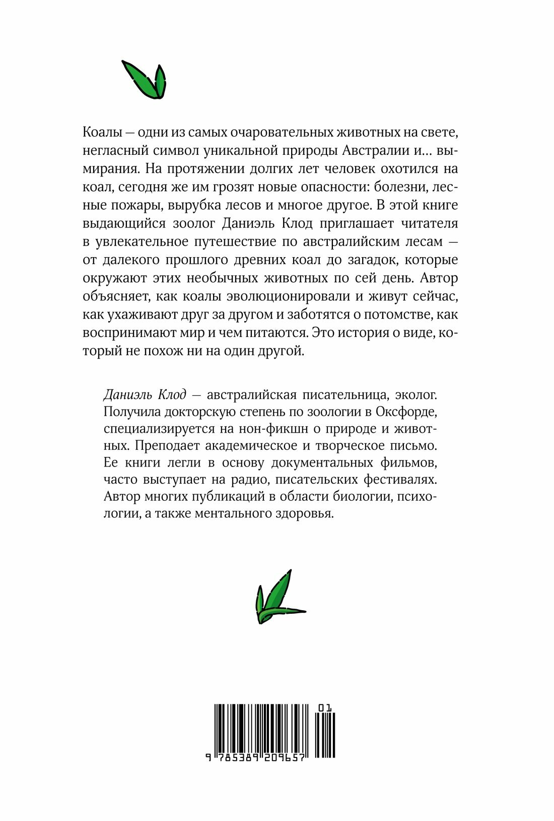 Коалы по праву считаются одними из самых популярных животных в мире. Большие глаза, круглые мордочки, особенности поведения — они больше похожи на плюшевых мишек, чем на настоящих обитателей диких лесов. Они знакомы нам по милым открыткам и роликам в интернете, набирающим много миллионов просмотров, но что мы в действительности знаем об этих загадочных существах? На протяжении всей жизни коалы питаются только ядовитыми эвкалиптовыми листьями: любое другое животное от такого рациона бы просто умерло. Коал трудно лечить, ведь их уникальный организм способен выводить токсины. Спускаясь с деревьев, коалы сами идут на контакт с человеком, просят о помощи и даже просто проявляют любопытство. Глубокое исследование Даниэль Клод проливает свет на жизнь этих чудесных животных: это настоящий гимн коалам, вдохновляющий читателя бережно относиться к нашему общему дому — окружающему миру. «Чем больше я пытаюсь узнать о коалах, тем больше понимаю, как многого мы еще не знаем о них. Мне не терпится разгадать тайны, которыми они окутаны, разоблачить мифы, исправить неточности» (Даниэль Клод).