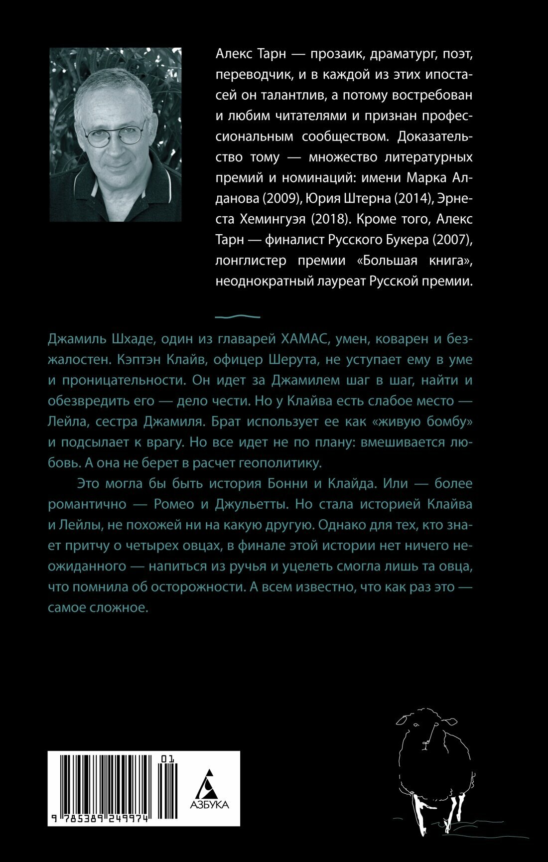 Увлекательный саспенс и интереснейшие философские размышления, эпический размах и пристальное внимание к судьбе каждого героя, живые, остроумные диалоги и неповторимая авторская интонация — все это вы найдете в романе Алекса Тарна «Четыре овцы у ручья». Джамиль Шхаде, один из главарей Хамас, умен, коварен и безжалостен. Кэптэн Клайв, офицер Шерута, не уступает ему в уме и проницательности. Он идет за Джамилем шаг в шаг, найти и обезвредить его — дело чести. Но у Клайва есть слабое место — Лейла, сестра Джамиля. Брат использует ее как «живую бомбу» и подсылает к врагу. Но все идет не по плану: вмешивается любовь. А она, как известно, не берет в расчет геополитику. Это могла бы быть история Бонни и Клайда. Или — более романтично — Ромео и Джульетты. Но стала историей Клайва и Лейлы, не похожей ни на какую другую. Но для тех, кто знает притчу о четырех овцах, в финале этой истории нет ничего неожиданного — напиться из ручья и уцелеть смогла лишь та овца, что помнила об осторожности. А всем известно, что как раз это — самое сложное.