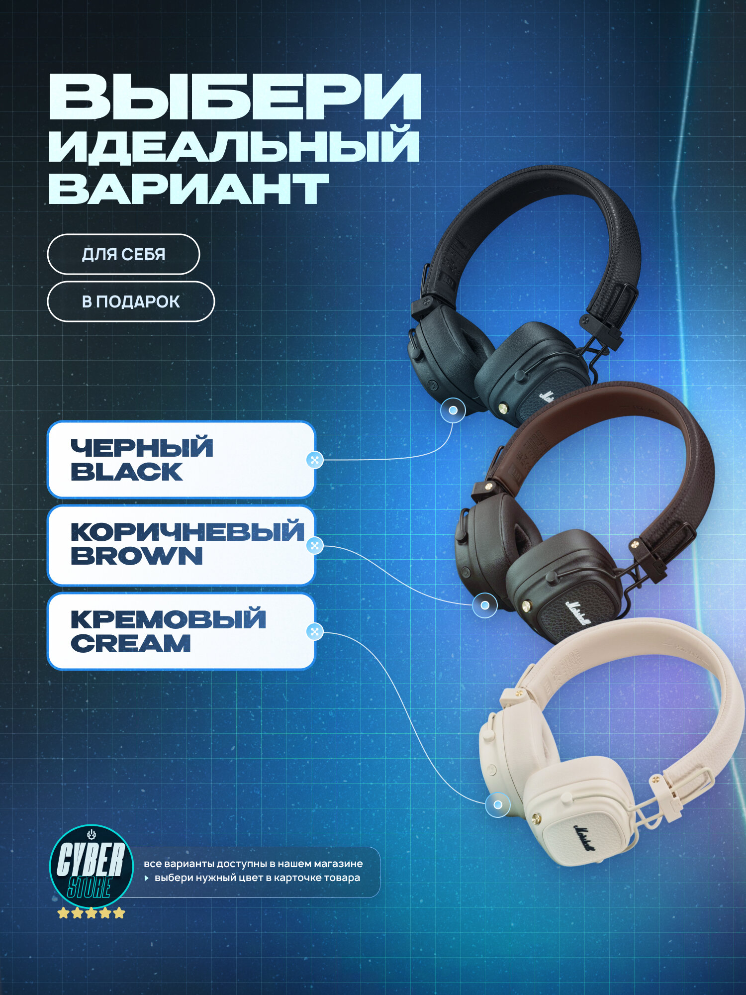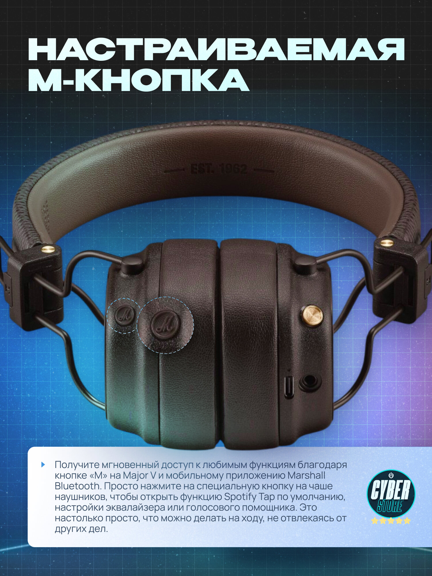 Встречайте Major V, культовые наушники от Marshall с более чем 100 часами беспроводного воспроизведения, беспроводной зарядкой и новым улучшенным эргономичным дизайном. С более чем тремя полными днями использования вы можете не беспокоиться о том, что ваши наушники перестанут работать, когда они вам понадобятся. Специально настроенные динамические драйверы обеспечивают ревущие басы, плавные средние и блестящие высокие частоты для богатого, непревзойденного звука, который вы никогда не захотите отключать.Беспроводная зарядкаНаушники Major V предлагают стабильное беспроводное воспроизведение в течение более 100 часов и возможность быстрой зарядки всего 15 минут зарядки дают 15 часов воспроизведения. Эти наушники созданы для долгой работы.Улучшенный, эргономичный дизайнНовый, улучшенный, эргономичный дизайн Major V это комфорт при долгом использовании: десятый час воспроизведения будет таким же комфортным, как и первый. Амбушюры Major V мягче и лучше повторяют форму уха.Многонаправленная кнопка управленияС помощью многонаправленной кнопки управления можно воспроизводить, ставить на паузу, переключать и регулировать громкость на своем устройстве, а также включать и выключать наушники. Кроме того, функция управления телефоном позволяет отвечать, отклонять или завершать звонки несколькими простыми движениями.Легендарный дизайн MarshallНаушники Major V сочетают в себе улучшенные эксплуатационные характеристики и классические элементы легендарного и инновационного дизайна Marshall: многонаправленную кнопку управления, текстурированные виниловые элементы и фирменный шрифт Marshall. С новой складной клипсой наушники Major V можно сложить еще компактнее, защищая чашки от избыточного износа.