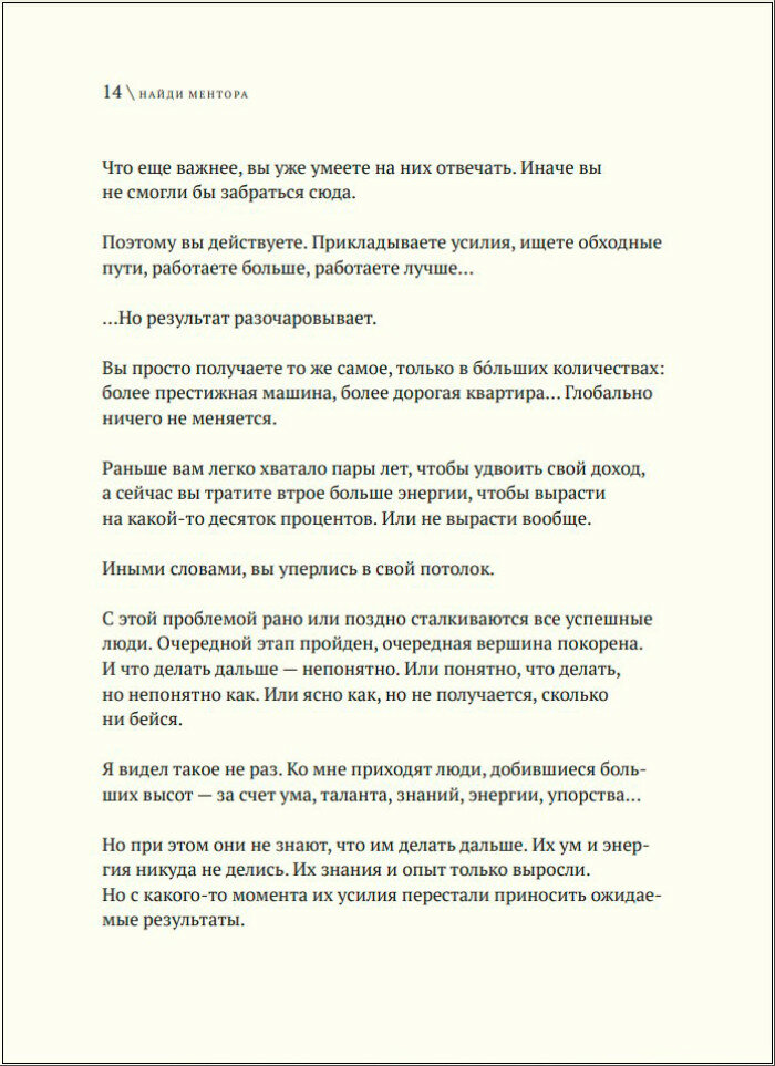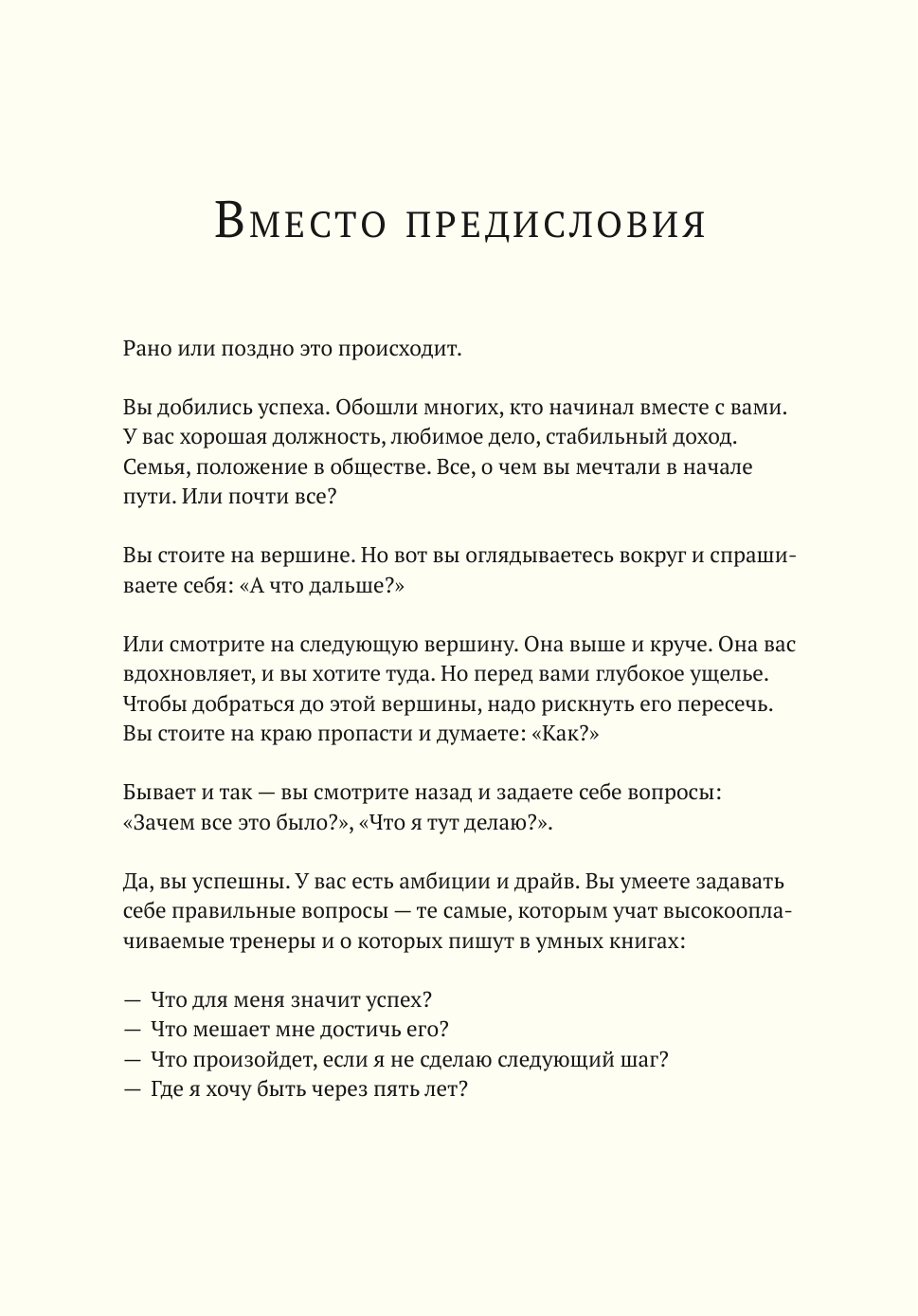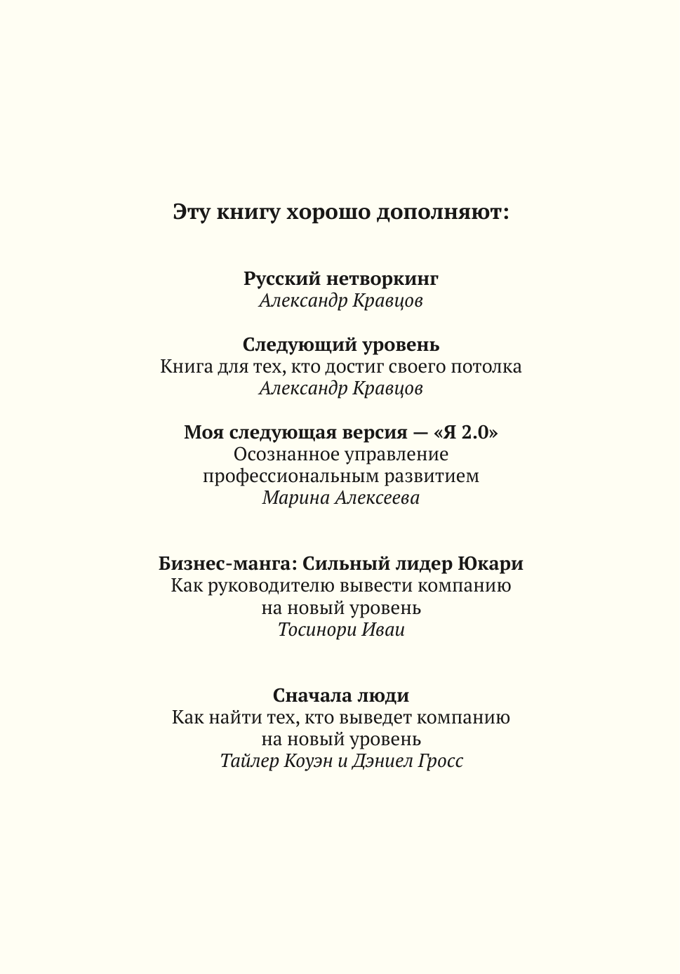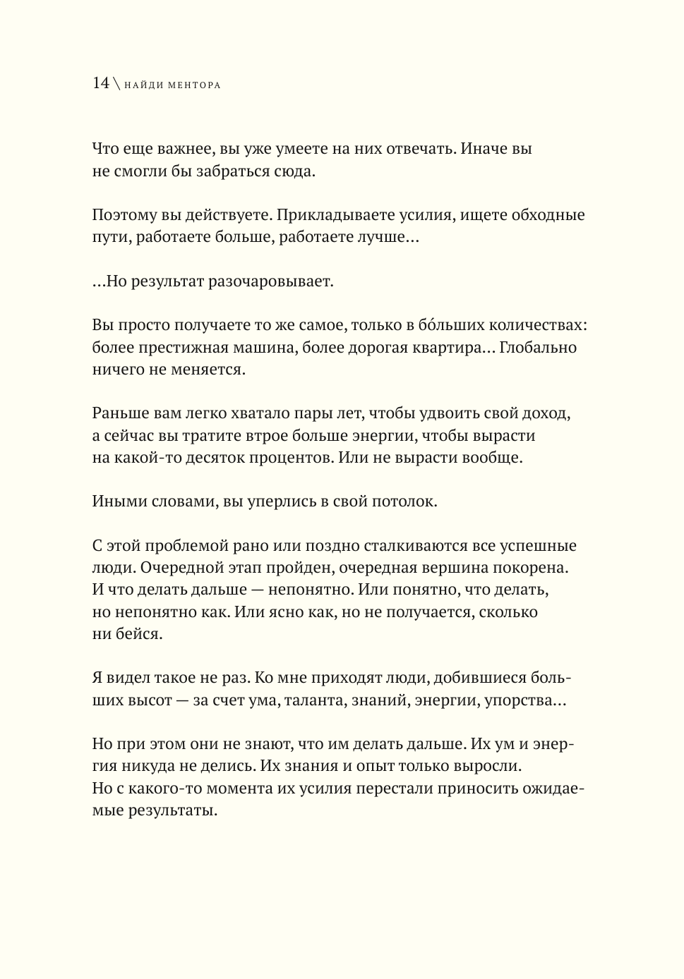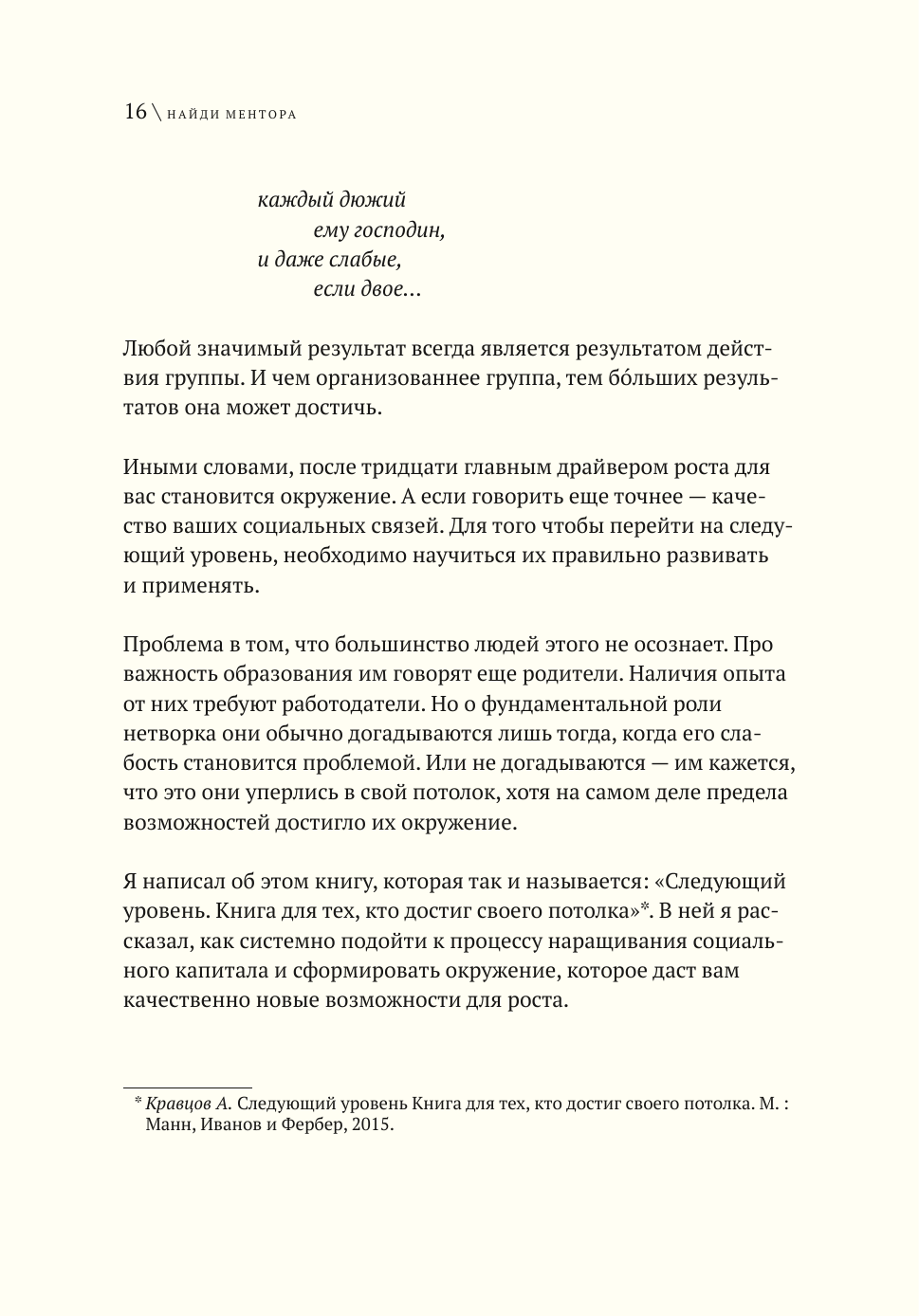 Книга расскажет, как сделать качественный рывок в развитии и прийти к максимальному успеху. Если вы ощущаете, что достигли своего потолка, но продолжаете искать новые возможности для роста, она для вас. Известный парадокс: в мире много действительно талантливых, компетентных и амбициозных людей, а значимых успехов добиваются лишь единицы. И даже в этом случае их результаты, чаще всего несопоставимо малы по сравнению с их подлинным потенциалом. Прочитав эту книгу, вы получите универсальный инструмент, благодаря которому сможете проанализировать себя, свое окружение и оценить его потенциал. Александр Кравцов крупнейший исследователь менторских практик на постсоветском пространстве, более 25 лет работает с представителями деловых и политических элит, делится секретами, которые позволяют добиться выдающихся результатов в карьере и бизнесе. Новое издание объединяет два бестселлера автора «Найди ментора. Как перейти на следующий уровень» и «Персональная стратегия. Книга для тех, кто не знает, куда идти дальше». Вы узнаете, как реализовать свой потенциал, выстроить долгосрочный вектор развития и выйти на качественно новый уровень успеха. Для кого книга Для руководителей и лидеров. Для всех, кто хочет максимально реализовать свой потенциал. Для тех, кто чувствует, что достиг своего потолка, но стремится подняться еще выше. Для тех, у кого есть амбиции.