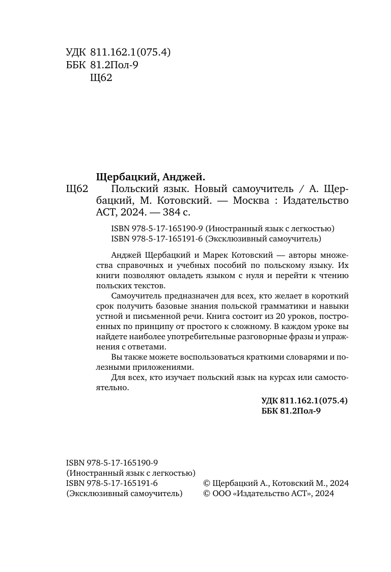Анджей Щербацкий и Марек Котовский — авторы множества справочных и учебных пособий по польскому языку. Их книги позволяют овладеть языком с нуля и перейти к чтению польских текстов.