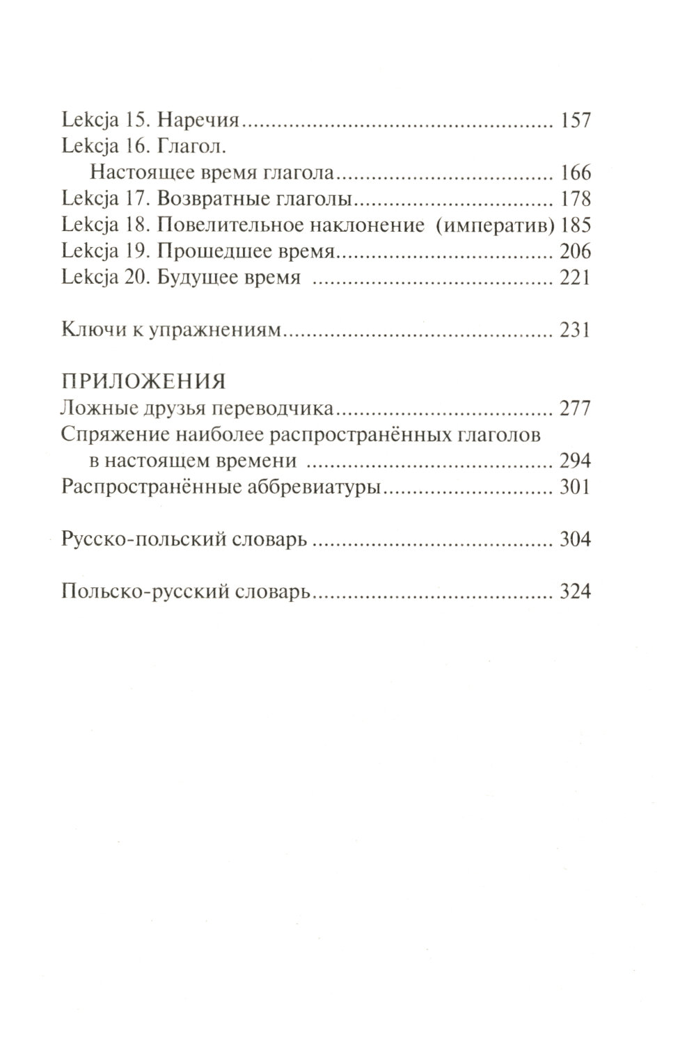 Самоучитель предназначен для всех, кто желает в короткий срок получить базовые знания польской грамматики и навыки устной и письменной речи. Книга состоит из 20 уроков, построенных по принципу от простого к сложному. В каждом уроке вы найдете наиболее употребительные разговорные фразы и упражнения с ответами.