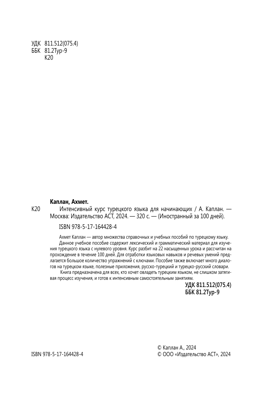 Ахмет Каплан автор множества справочных и учебных пособий по турецкому языку. Данное учебное пособие содержит лексический и грамматический материал для изучения турецкого языка с нулевого уровня. Курс разбит на 22 насыщенных урока и рассчитан на прохождение в течение 100 дней. Для отработки языковых навыков и речевых умений предлагается большое количество упражнений с ключами. Пособие также включает много диалогов на турецком языке, полезные приложения, русско-турецкий и турецко-русский словарь. Книга предназначена для всех, кто хочет овладеть турецким языком, не слишком затягивая процесс изучения, и готов к интенсивным самостоятельным занятиям.
