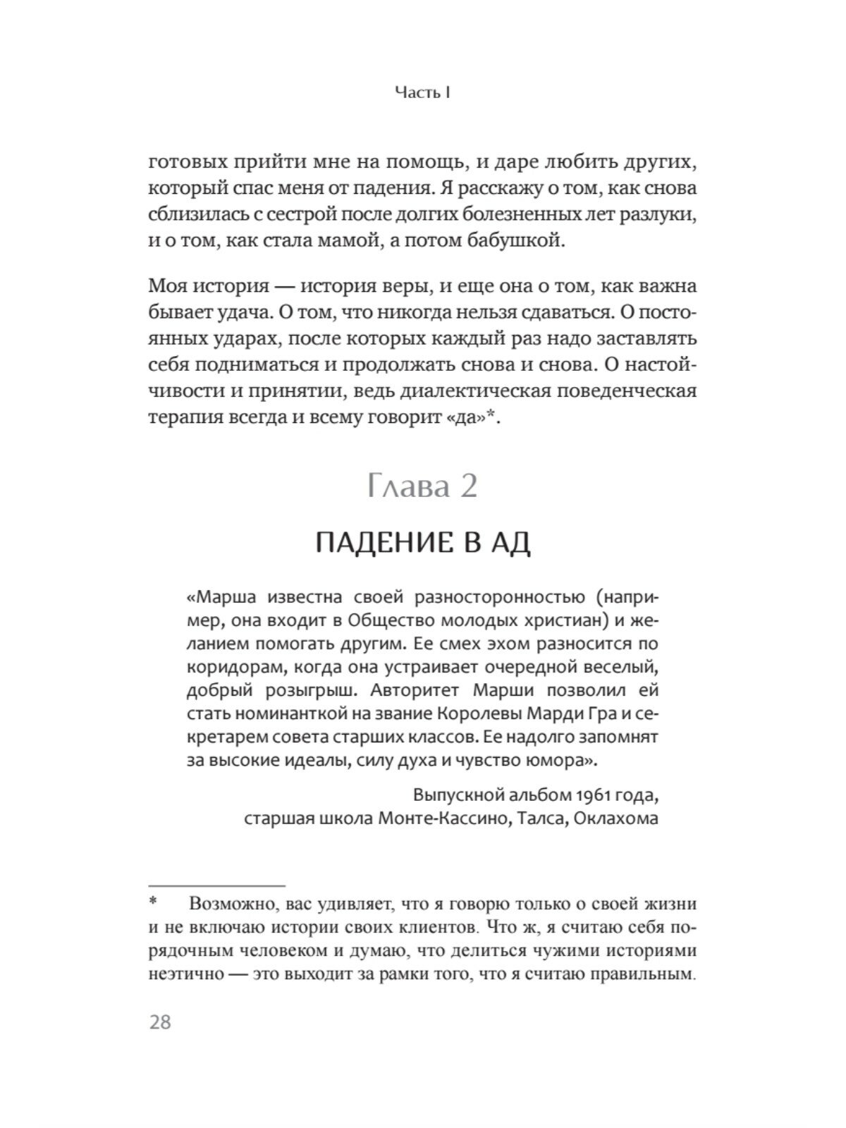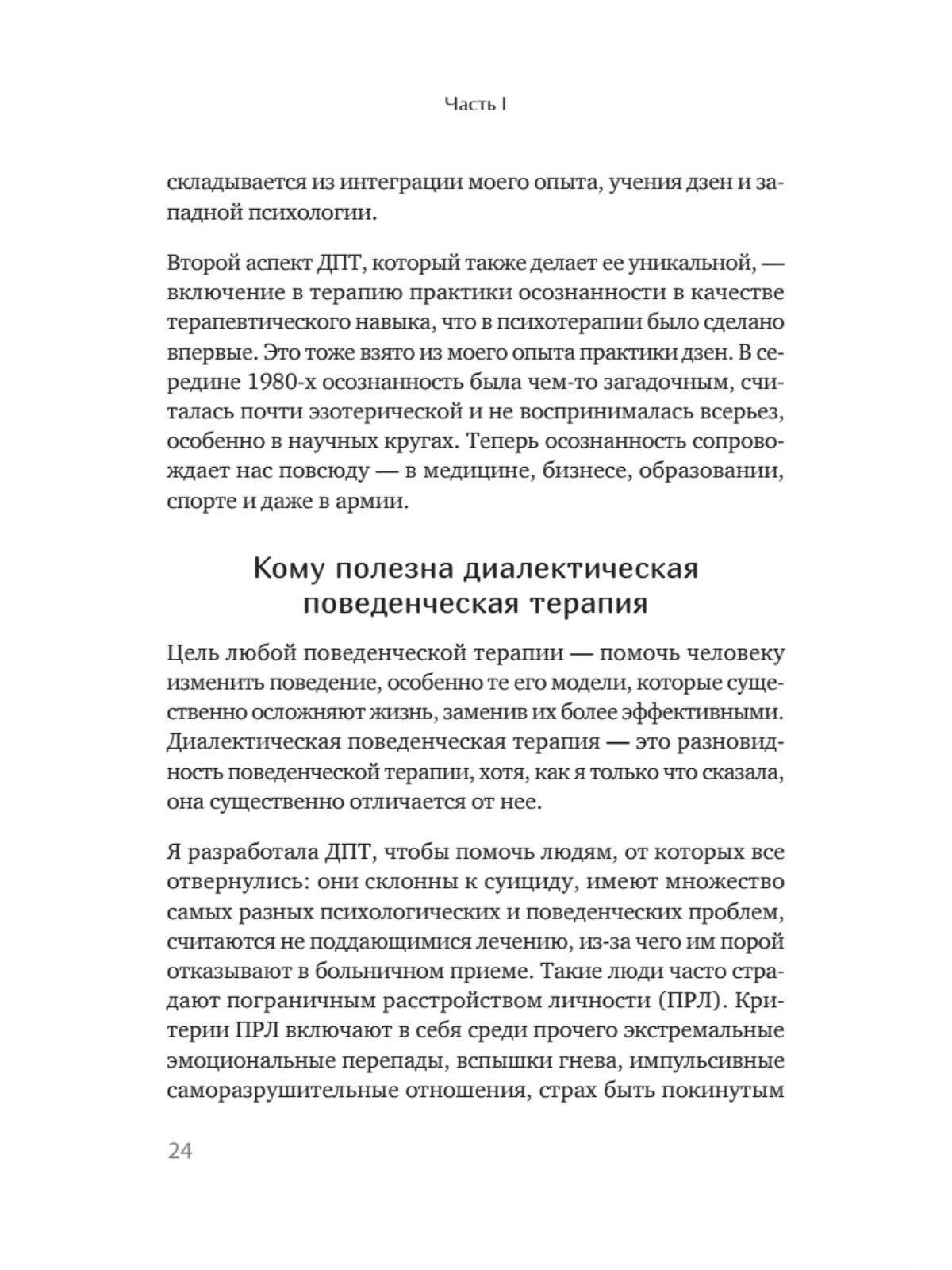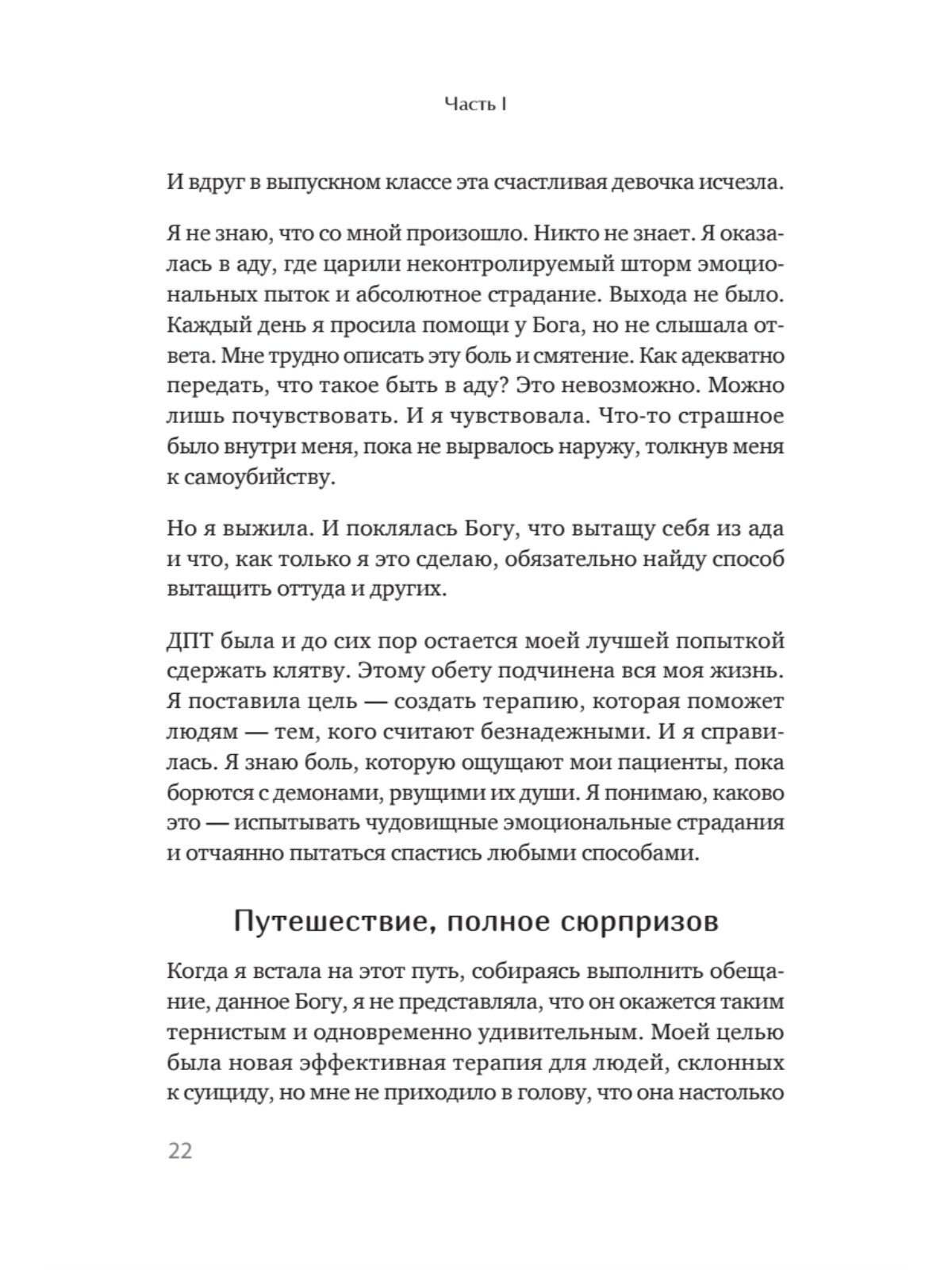 Разработанная ею диалектическая поведенческая терапия спасла жизни огромного числа людей, склонных к депрессии и суициду, людей с пограничным расстройством личности и другими тяжелыми психическими расстройствами. Однако доктор Линехан никогда не рассказывала, что ее новаторская работа неотделима от ее собственной истории. В ранней молодости Марша поклялась, что если ей удастся выбраться из ада, в который превратилась ее жизнь, то она приложит все усилия, чтобы помочь выбраться и другим. Она сдержала обещание, пройдя путь от девушки, запертой в психушке, до всемирно известного создателя терапии. Линехан учит людей тому, что каждый человек, какой бы невыносимой не была его жизненная ситуация, может построить жизнь, достойную проживания.Пять причин прочитать:Автор книги включен в список журнала Time "Великие ученые: гении и провидцы, которые изменили мир".Впервые создательница всемирно признанного метода психотерапии рассказывает о своем пограничном расстройстве.Узнаете основы диалектико-поведенческой терапии и чем она отличается от остальных методов психотерапии.Научит понимать людей с пограничным расстройством личности.Это вдохновляющая история исцеления "неизлечимого" человека.