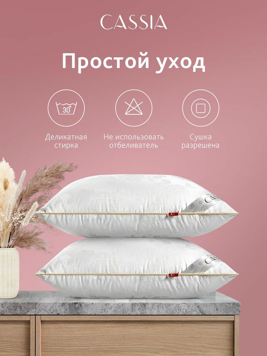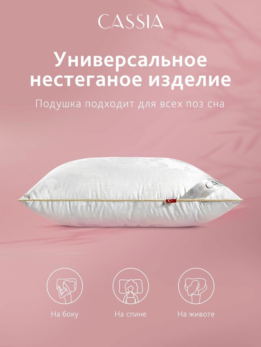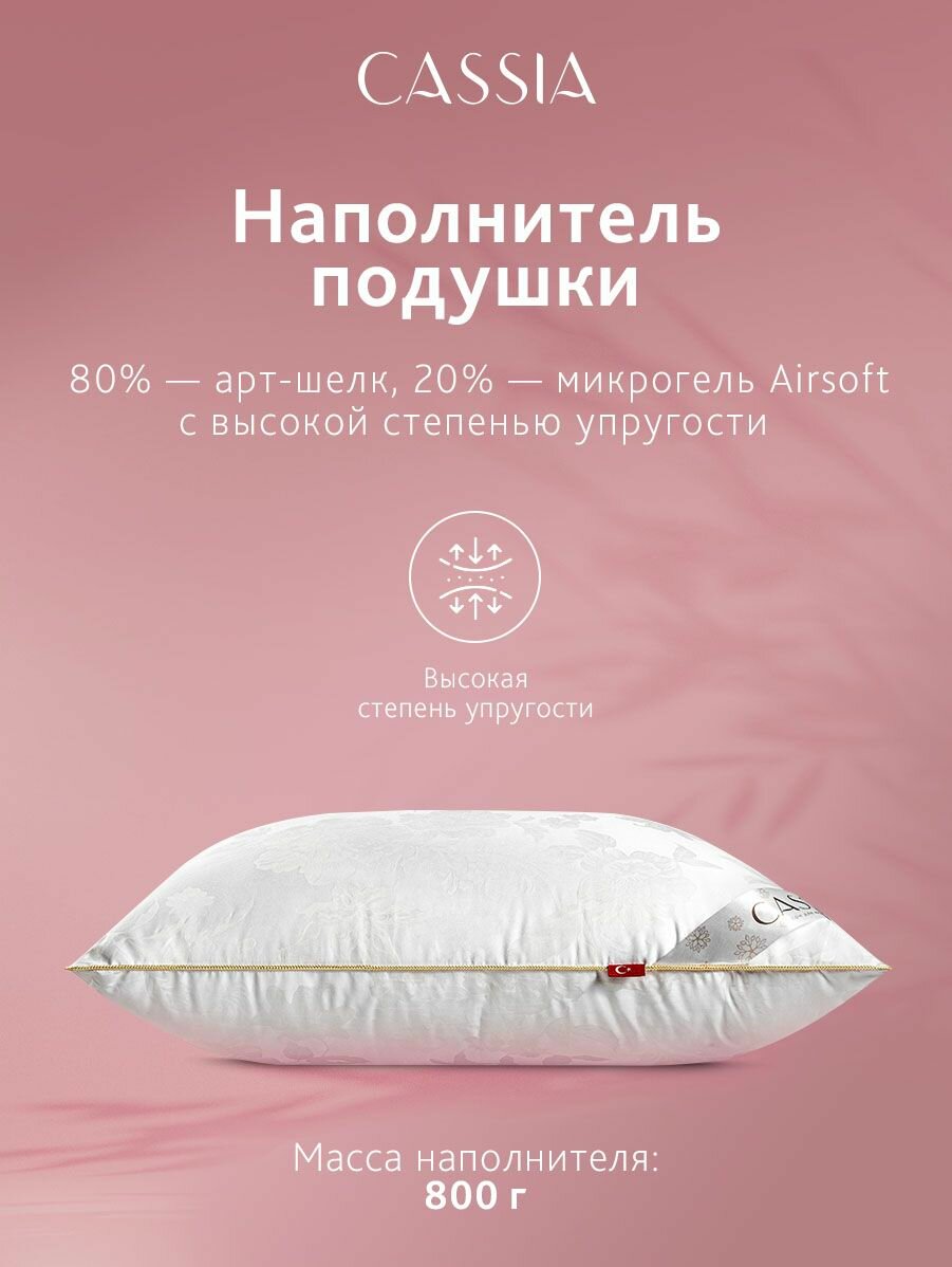 Подушка «Айлин» 50х70 см бренда CASSIA имеет чехол из 50% хлопка, 50% вискозного шелка; жаккардовое плетение с классическим орнаментом; наполнитель из 100% микрогеля Airsoft.Микрогель Airsoft — инновационный наполнитель, который отличается формоустойчивостью и долговечностью, не вызывает аллергии. Особая конструкция этого полого внутри волокна создает объем и воздушность, которые сохраняются на протяжении всего срока службы изделия.Дополнительный объем и особую упругость подушке придает вставка из специальной ткани, вшитая по периметру изделия, которая служит пружинящим элементом и способствует отличному воздухообмену.Жаккард — достаточно плотный материал из натурального хлопка и вискозы жаккардового переплетения, который обладает легким блеском и объемным рисунком. Такая ткань гипоаллергенная, гигроскопичная, износостойкая. Она выглядит элегантно благодаря своему составу.Изделие на основе вискозного волокна — универсальный всесезонный вариант, который обладает антистатическими и антибактериальными свойствами, улучшает обмен веществ, нормализует кровообращение спящего человека. Подушка окантована плетеным серебряным кантом, который украшает и позволяет ей дольше держать форму.Подушку «Айлин» можно преподнести как оригинальный подарок лучшей подруге, девушке, парню, маме, папе, сестре, брату, учителю, другу, родителям, коллеге без повода или по случаю праздника: день рождения, новоселье, Новый год, 8 Марта, выпускной, День матери, 14 февраля, 23 Февраля, юбилей.