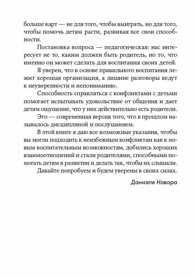 Даниэле Новара, дипломированный итальянский психолог с огромным опытом, считает, что конфликты могут быть полезны для развития личности и формирования здоровых отношений внутри семьи, нужно лишь научиться правильно их «проживать». В этой книге собраны практические советы о том, как построить общение с подростками и ребятами школьного и дошкольного возраста с учетом особенностей их психологии и как научиться держать себя в руках, когда, казалось бы, никаких сил уже не осталось.