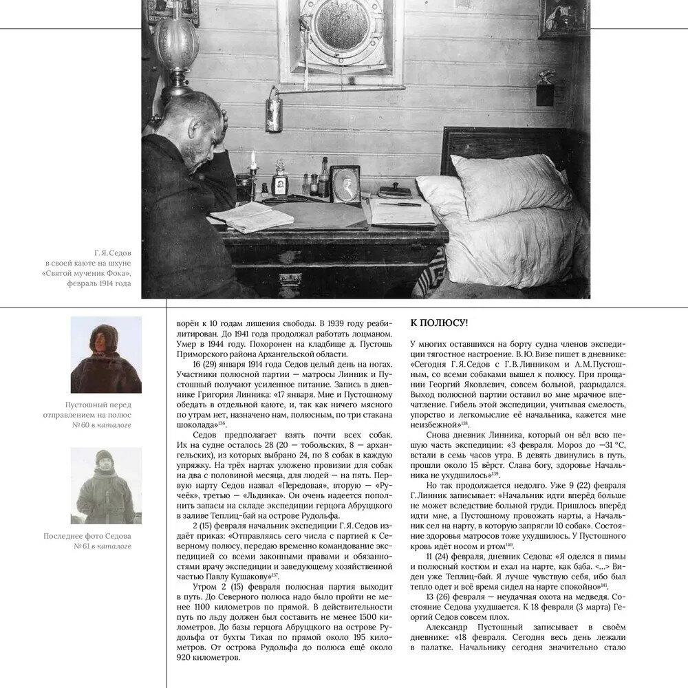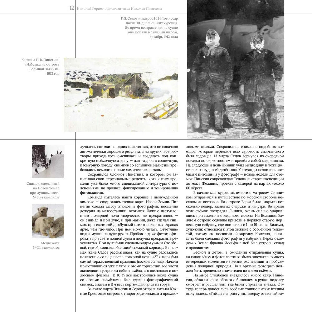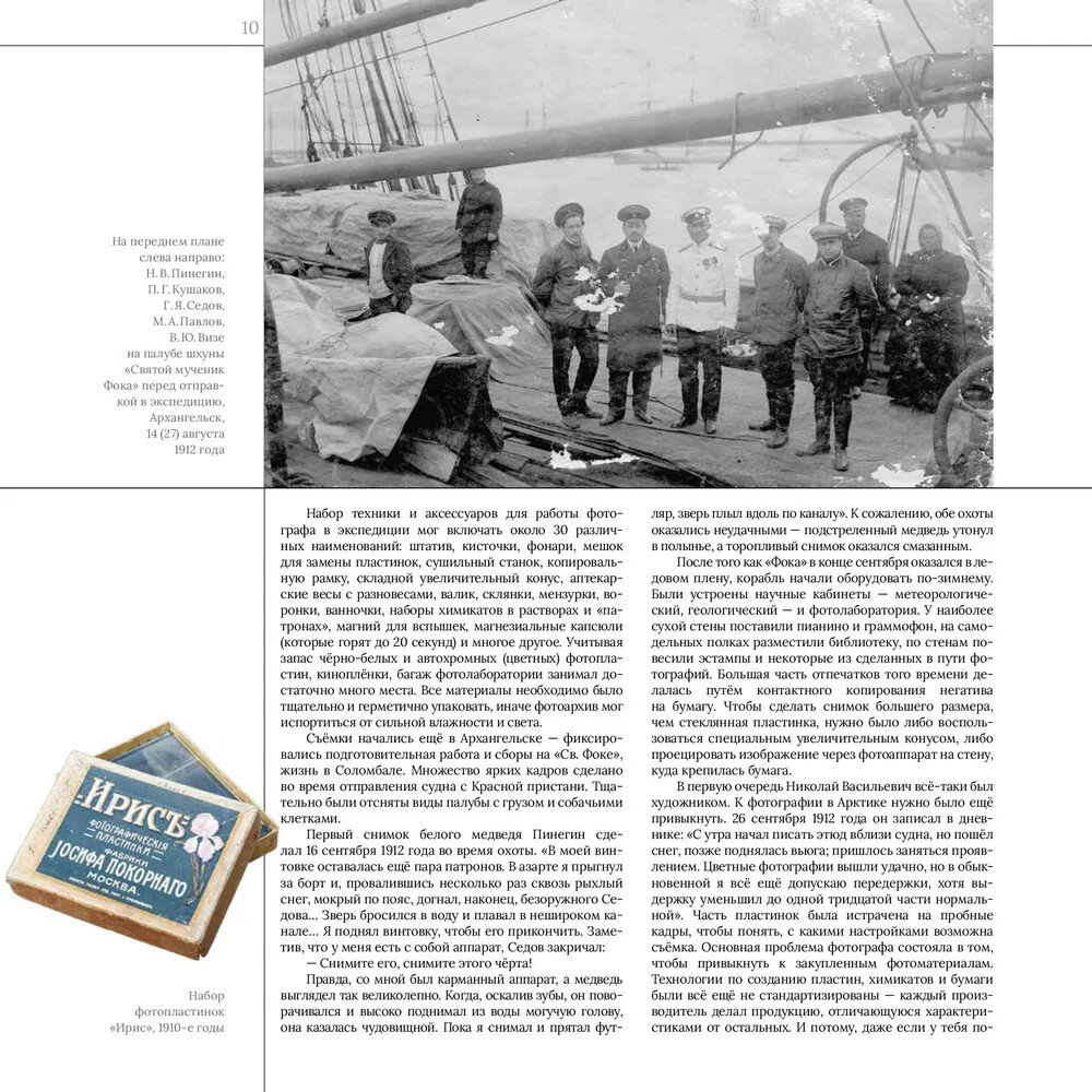 Научно-популярное издание представляет собой опыт обобщения информации, посвящённой первой русской научной экспедиции к Северному полюсу под руководством старшего лейтенанта Г.?Я.?Седова 1912—1914 годов. Основу издания составляет каталог уникальной коллекции цветных диапозитивов, сделанных в ходе этой экспедиции знаменитым полярником, художником и фотографом Николаем Васильевичем Пинегиным, которые хранятся в фондах Северного морского музея (г. Архангельск). Авторами обобщён и представлен широкий комплекс разнообразных источников и фактов, раскрывающих ход полярной экспедиции и её результаты. Издание адресовано широкому кругу читателей, всем, кто интересуется историей освоения Арктики.
