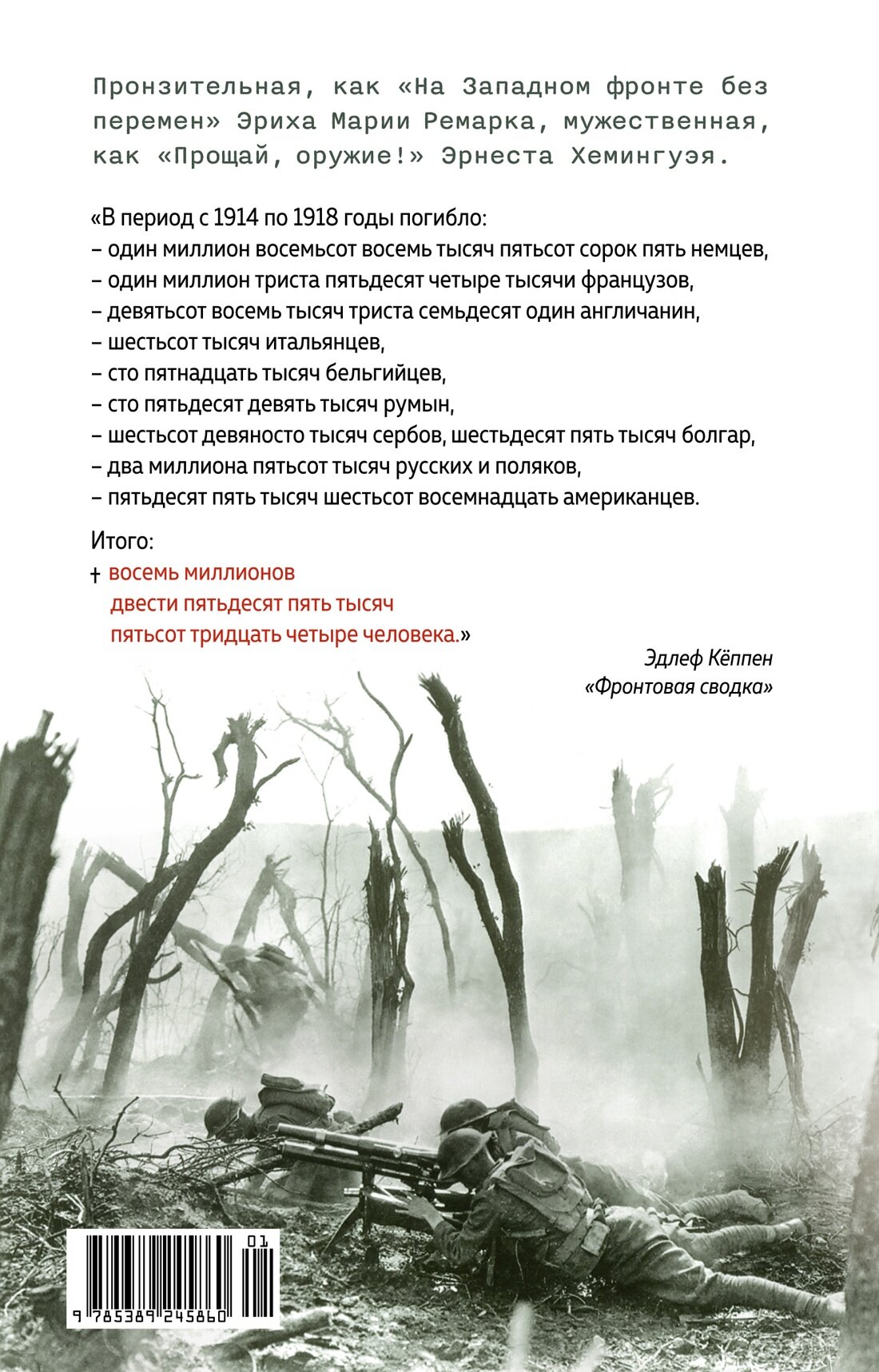 Опубликованная в 1930 г. «Фронтовая сводка» стал одним из знаковых романов о Первой мировой войне, наряду с произведениями Э.М. Ремарка «На Западном фронте без перемен», Р. Олдингтона «Смерть героя» и Э. Хемингуэя «Прощай, оружие!». Участник Первой мировой войны, ушедший на фронт добровольцем с третьего курса философского факультета университета, Эдлеф Кёппен создал «монтажный роман», где оригинальные документы – цитаты из воззваний императора Вильгельма II, указы цензурных органов, газетные сообщения органично вплетены в сюжет, а прообразом главного героя Адольфа Райзигера является сам автор. «Фронтовая сводка» стала одной из десятков тысяч книг, публично сожженных в Германии в 1933 году, и не публиковалась в ФРГ до 1976 г., а в ГДР до 1981. В начале века роман вновь привлек к себе внимание, был многократно переиздан и переведен на несколько языков.