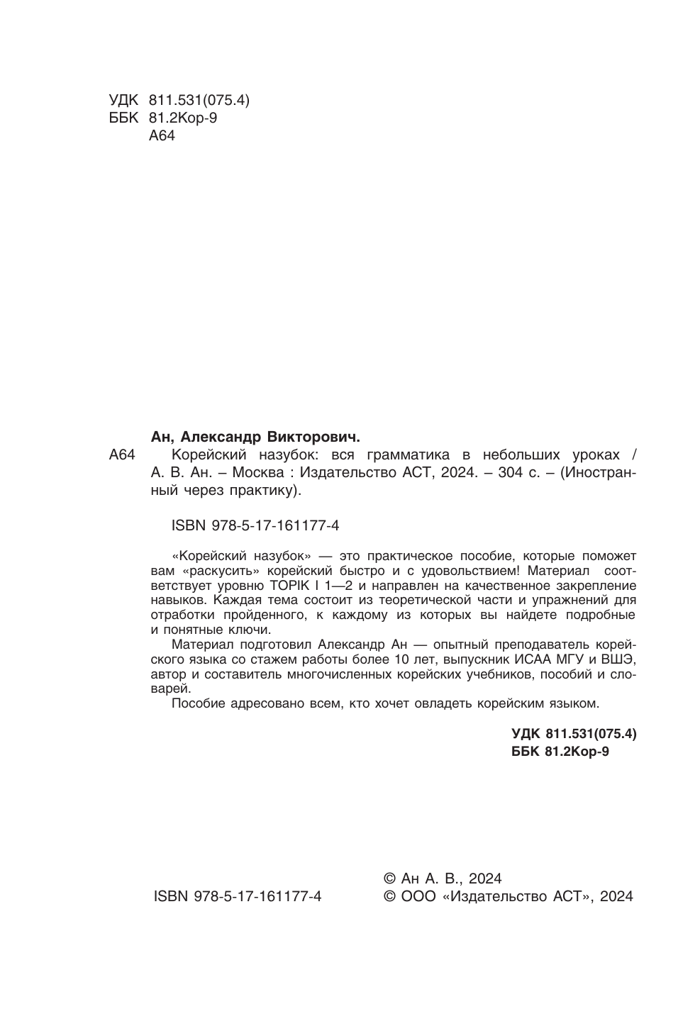 «Корейский назубок» — это практическое пособие, которые поможет вам «раскусить» корейский быстро и с удовольствием! Материал соответствует уровню TOPIK I 1—2 и направлен на качественное закрепление навыков. Каждая тема состоит из теоретической части и упражнений для отработки пройденного, к каждому из которых вы найдете подробные и понятные ключи. Материал подготовил Александр Ан — опытный преподаватель корейского языка со стажем работы более 10 лет, выпускник ИСАА МГУ и ВШЭ, автор и составитель многочисленных корейских учебников, пособий и словарей. Пособие адресовано всем, кто хочет овладеть корейским языком.
