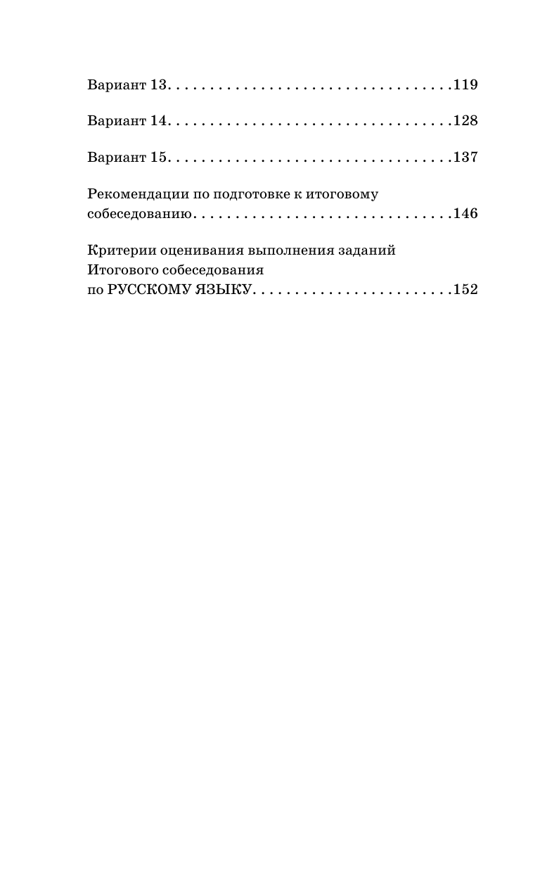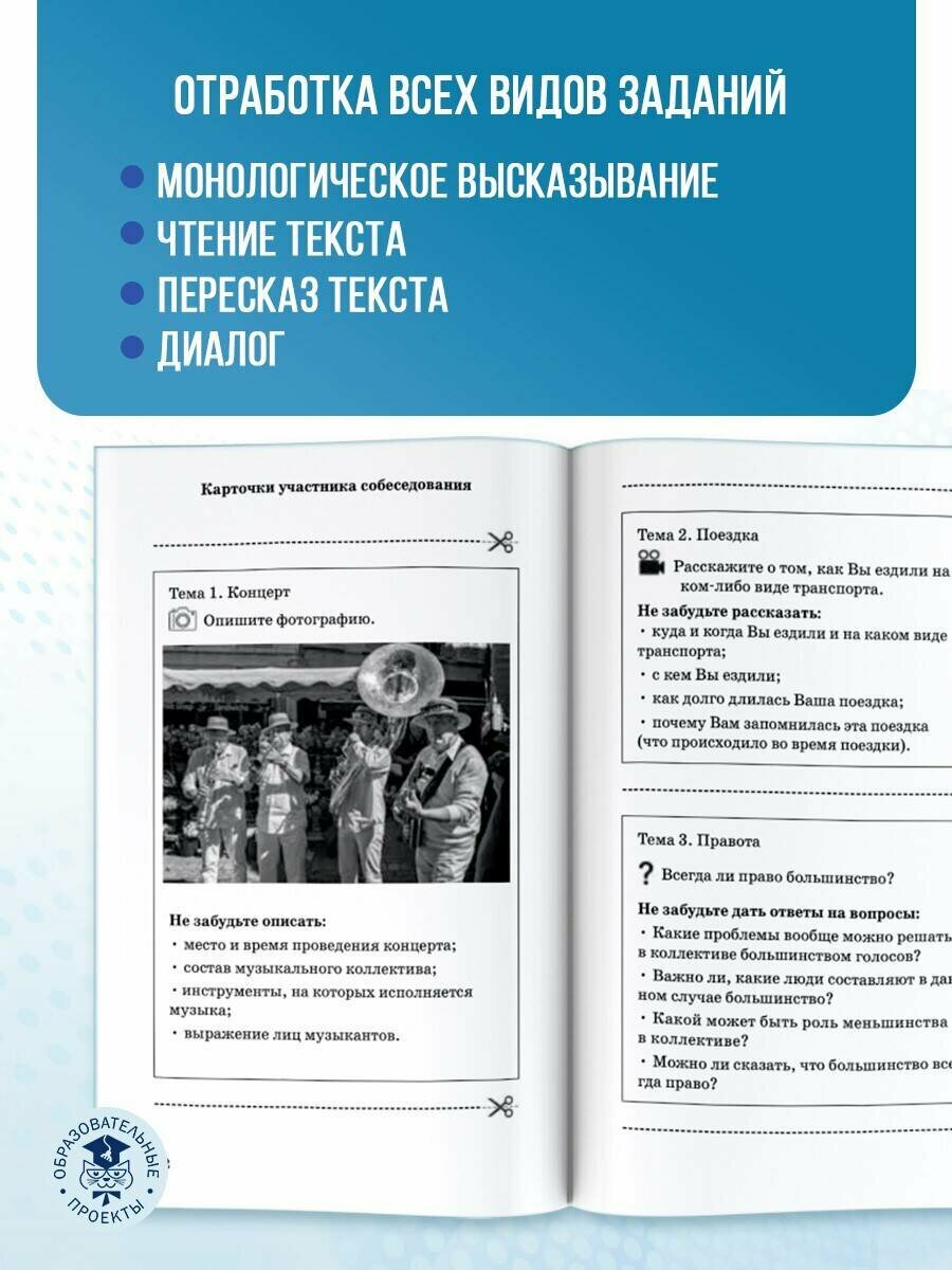 Цель пособия — помочь учащимся 9 классов подготовиться к итоговому собеседованию, являющемуся допуском к основному государственному экзамену. Книга содержит 15 вариантов собеседования учащегося с преподавателем, которые по своему содержанию точно соответствуют экзаменационным материалам и позволяют подготовиться к предстоящему испытанию. Каждый вариант включает четыре типа заданий: выразительное чтение вслух текста о выдающихся людях России, пересказ текста с привлечением дополнительной информации, тематическое монологическое высказывание и диалог, а также иллюстрированные карточки участника собеседования и карточки собеседника-экзаменатора. В книге даны рекомендации по выполнению каждого задания экзаменационной работы и критерии оценивания их выполнения, что позволяет составить представление о требованиях к полноте и правильности развёрнутых ответов в устной форме. Сборник будет полезен и учителям, которые найдут в нём необходимый материал для работы на уроках.