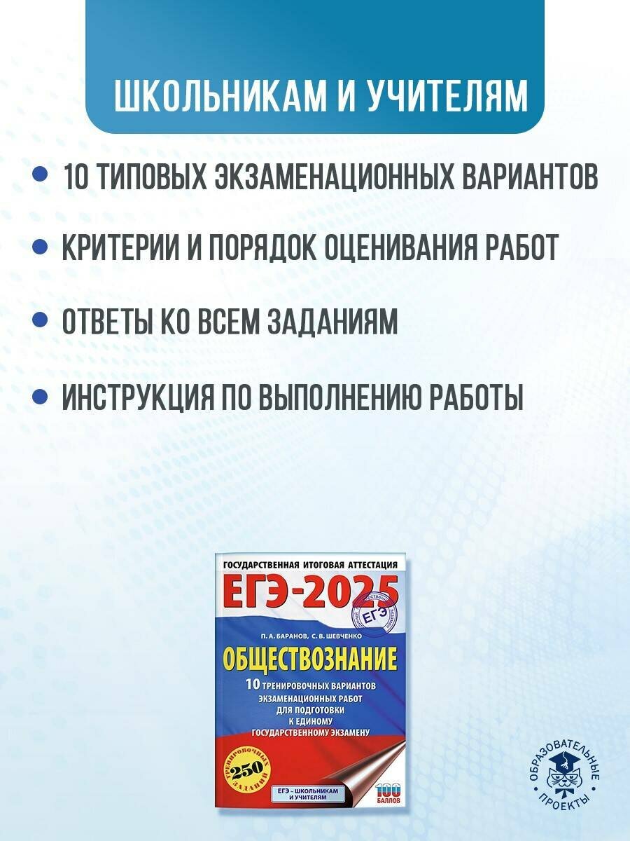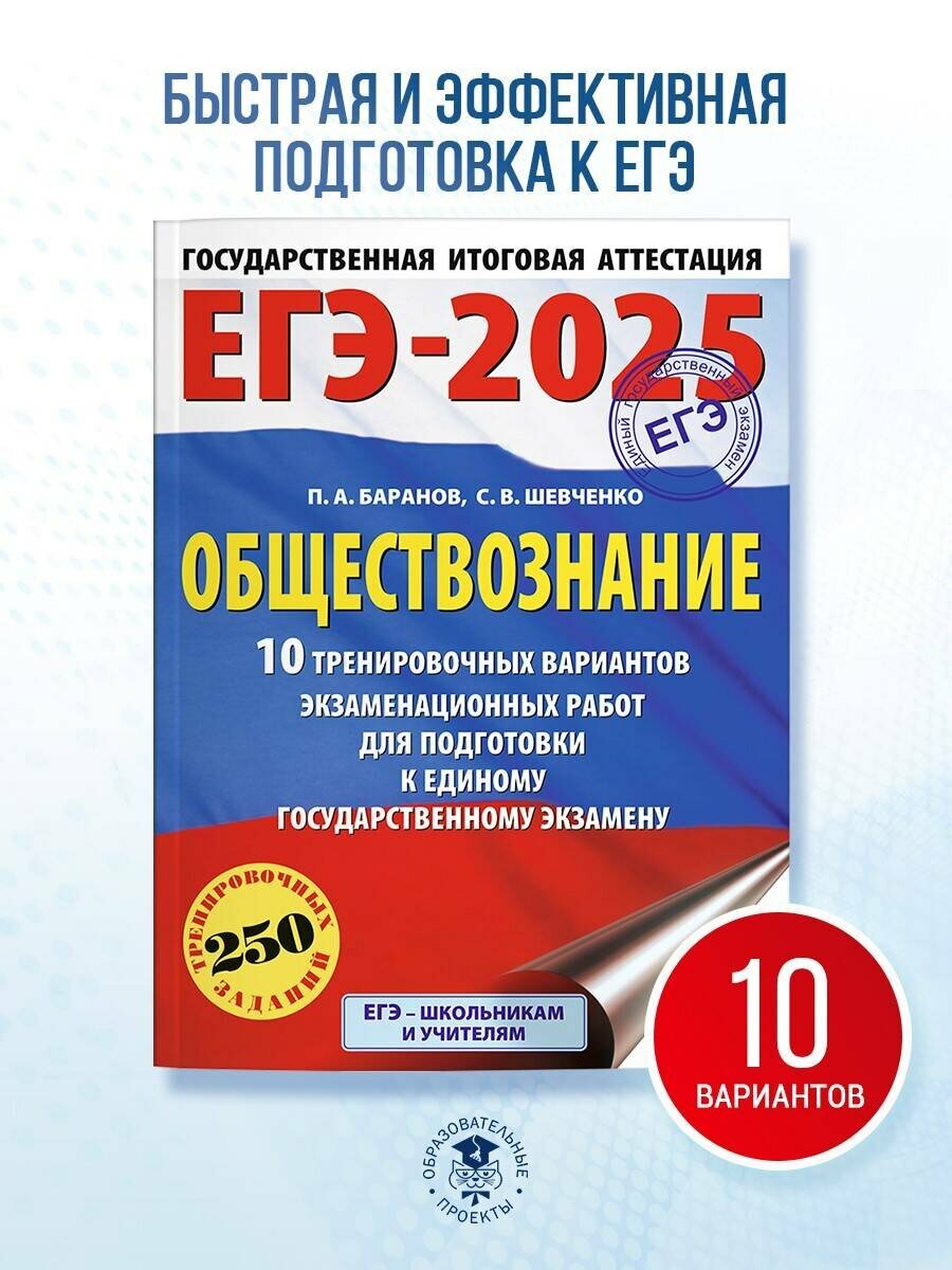 ЕГЭ-2025. Обществознание. 10 тренировочных вариантов экзаменационных работ для подготовки к единому государственному экзамену (Сергей Владимирович Шевченко, Пётр Анатольевич Баранов); Образовательные проекты, 2024