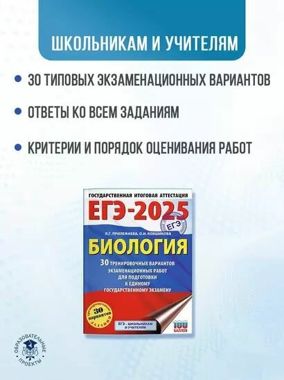 ЕГЭ-2025. Биология. 30 тренировочных вариантов экзаменационных работ для подготовки к единому государственному экзамену (Лариса Георгиевна Прилежаева, Ольга Ивановна Ковшикова); Образовательные проекты, 2024
