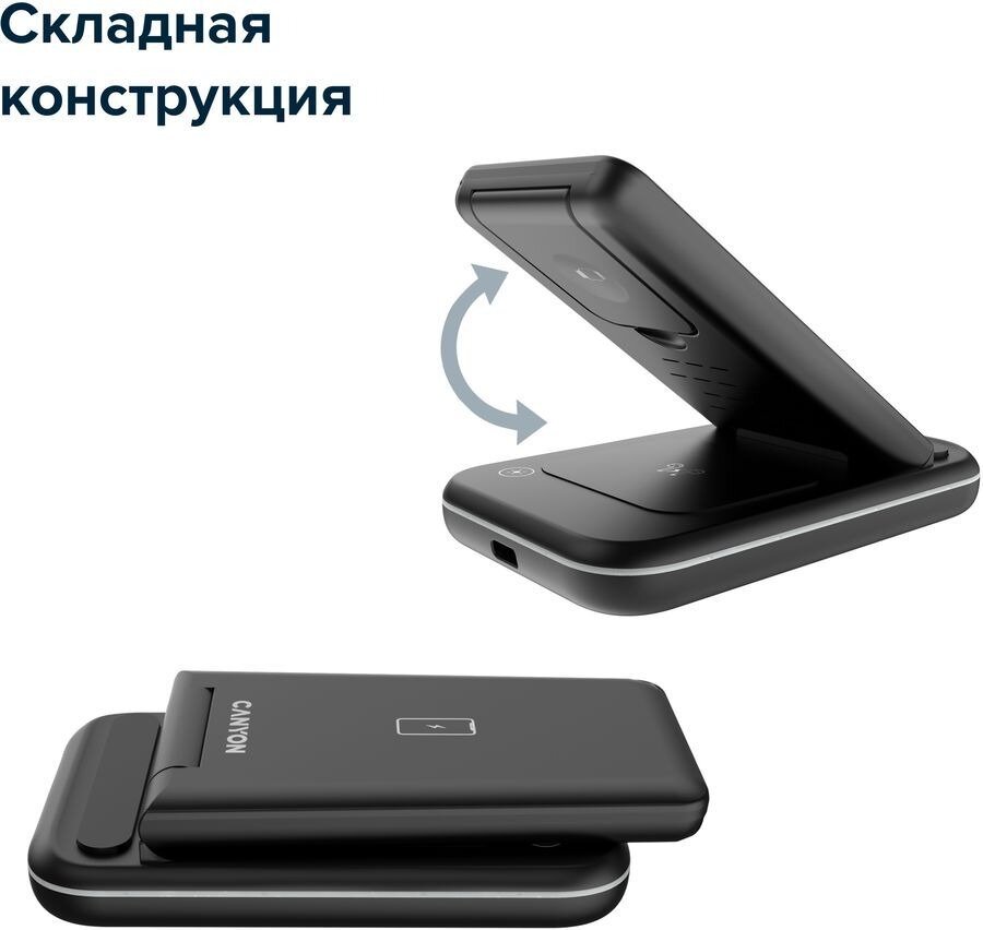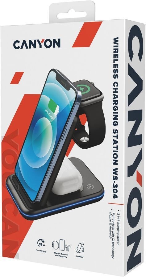 CANYON WS-304, Foldable 3in1 Wireless charger, with touch button for Running water light, Input 9V/2A, 12V/1.5AOutput 15W/10W/7.5W/5W, Type c to USB-A cable length 1.2m, with QC18W EU plug,132.51*75*28.58mm, 0.168Kg, Iced Pink