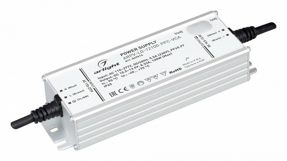 Регулируемый источник напряжения и тока с гальванической развязкой применяется для питания различных типов светодиодных изделий. Встроенные регуляторы позволяют подстраивать выходное напряжение и уменьшать выходной ток. При полной нагрузке работает как источник тока с возможностью его регулировки. Металлический корпус обладает хорошим теплоотводом, а высокая степень влагозащиты IP67 позволяет использовать устройство как внутри, так и вне помещений, с соблюдением правил и требований к установке. Высокая эффективность и расширенная гарантия 5 лет - основные преимущества линейки ARPV-LG.