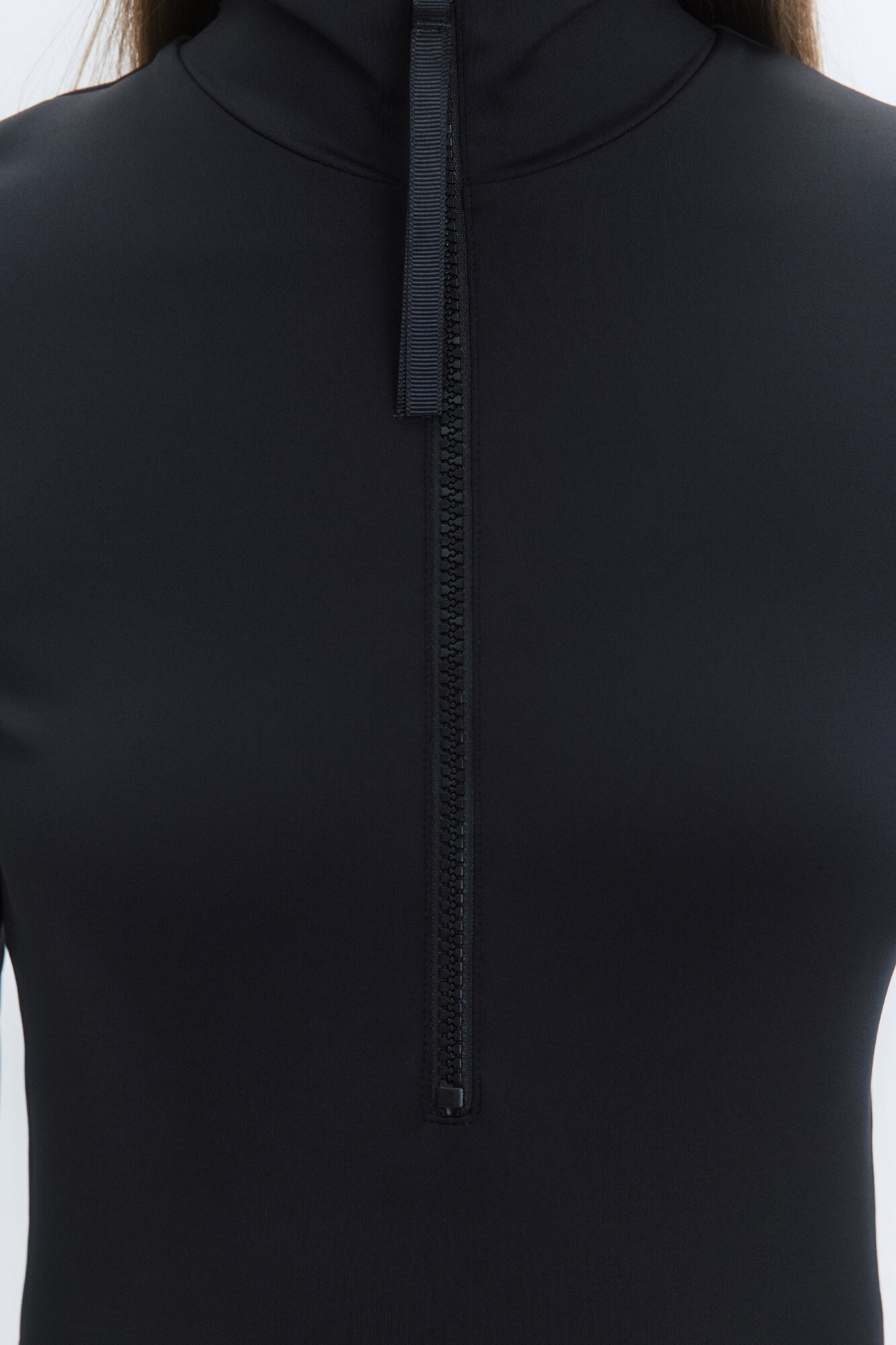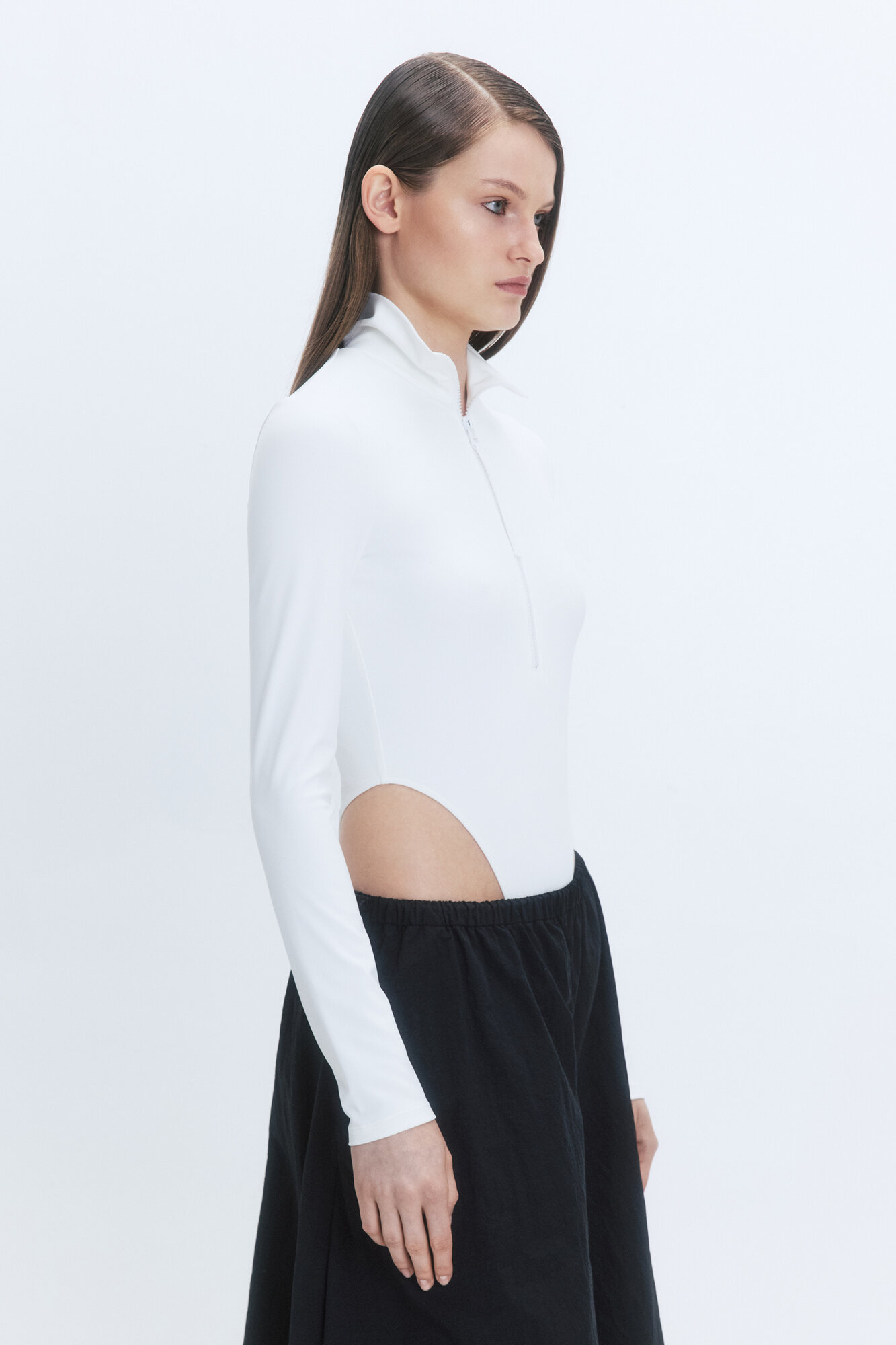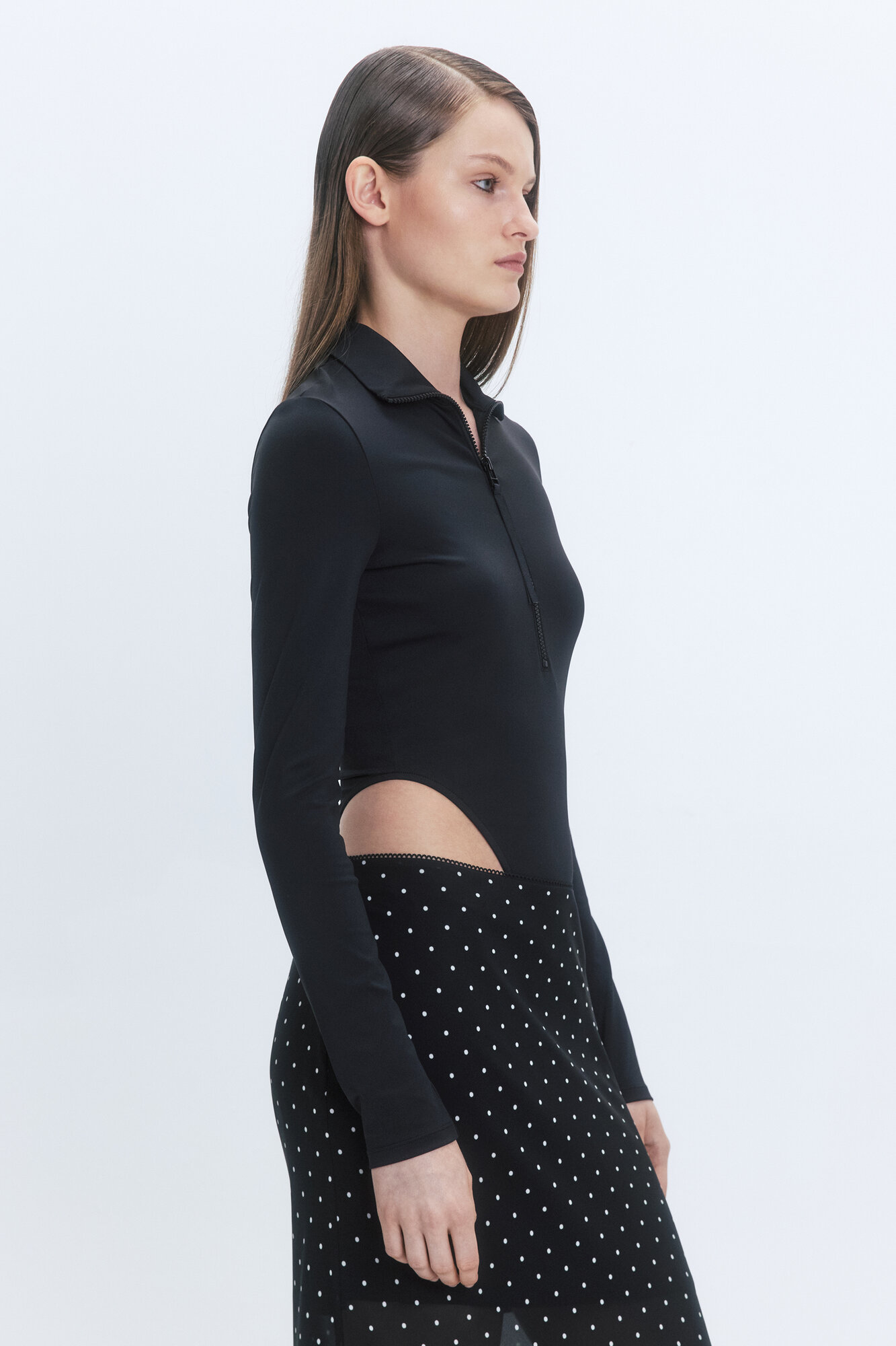 - Высокий воротник-стойка на молнии, который можно носить как отложной воротничок с V-образным вырезом. Длинные облегающие рукава с прямыми манжетами и прямой линией плеча. Высокие трусики-бразильяна с застежкой на кнопки снизу и боковыми вырезами
