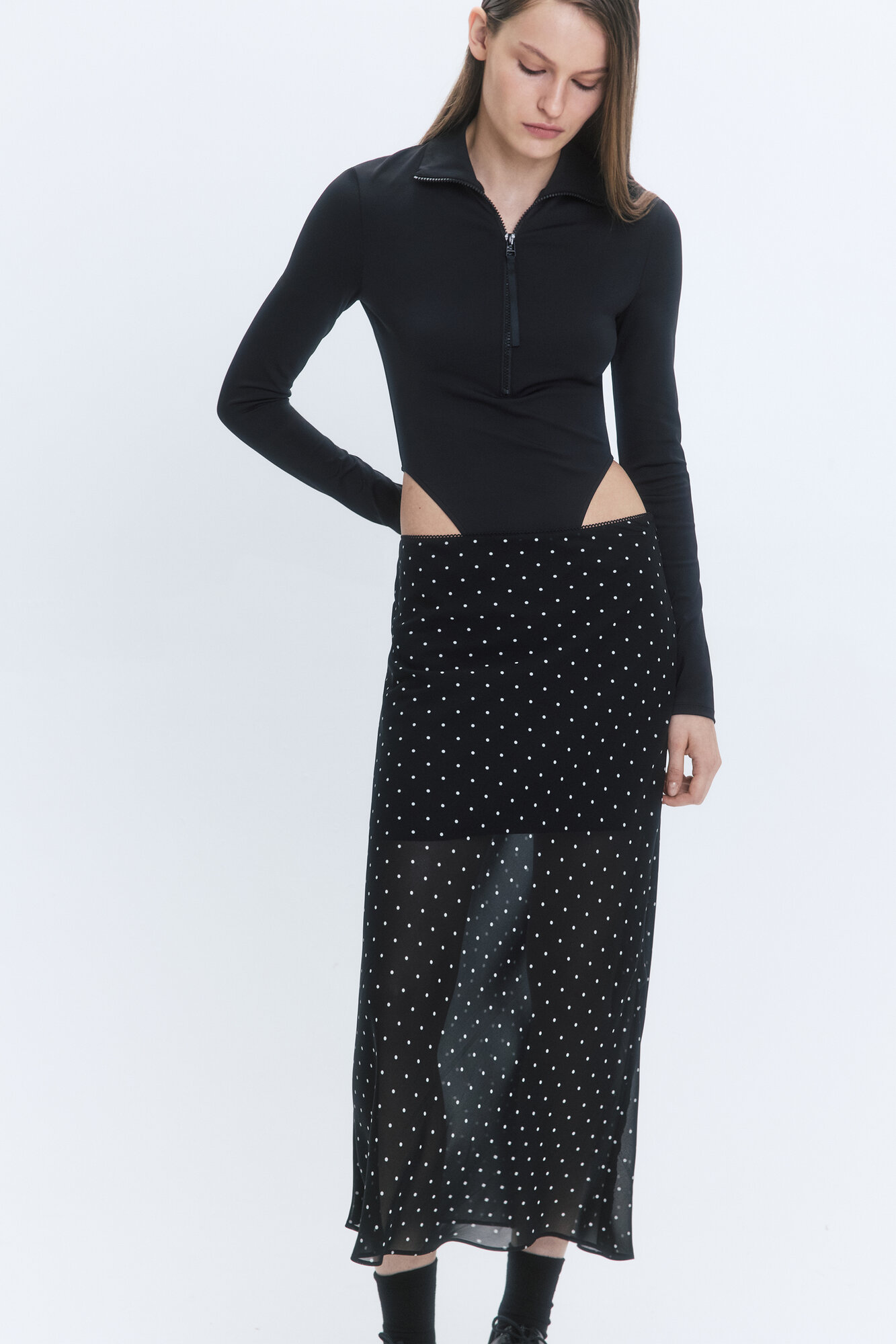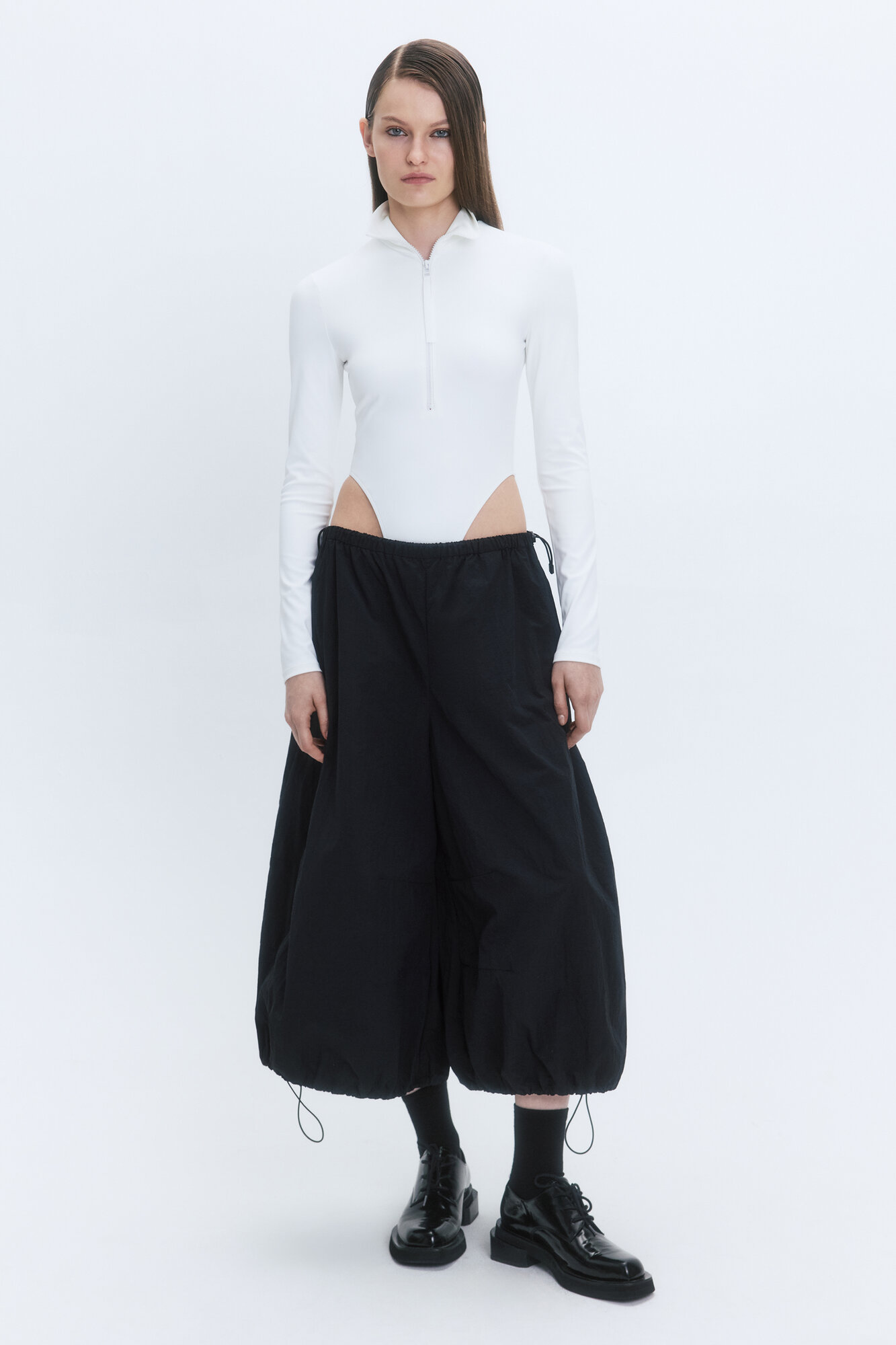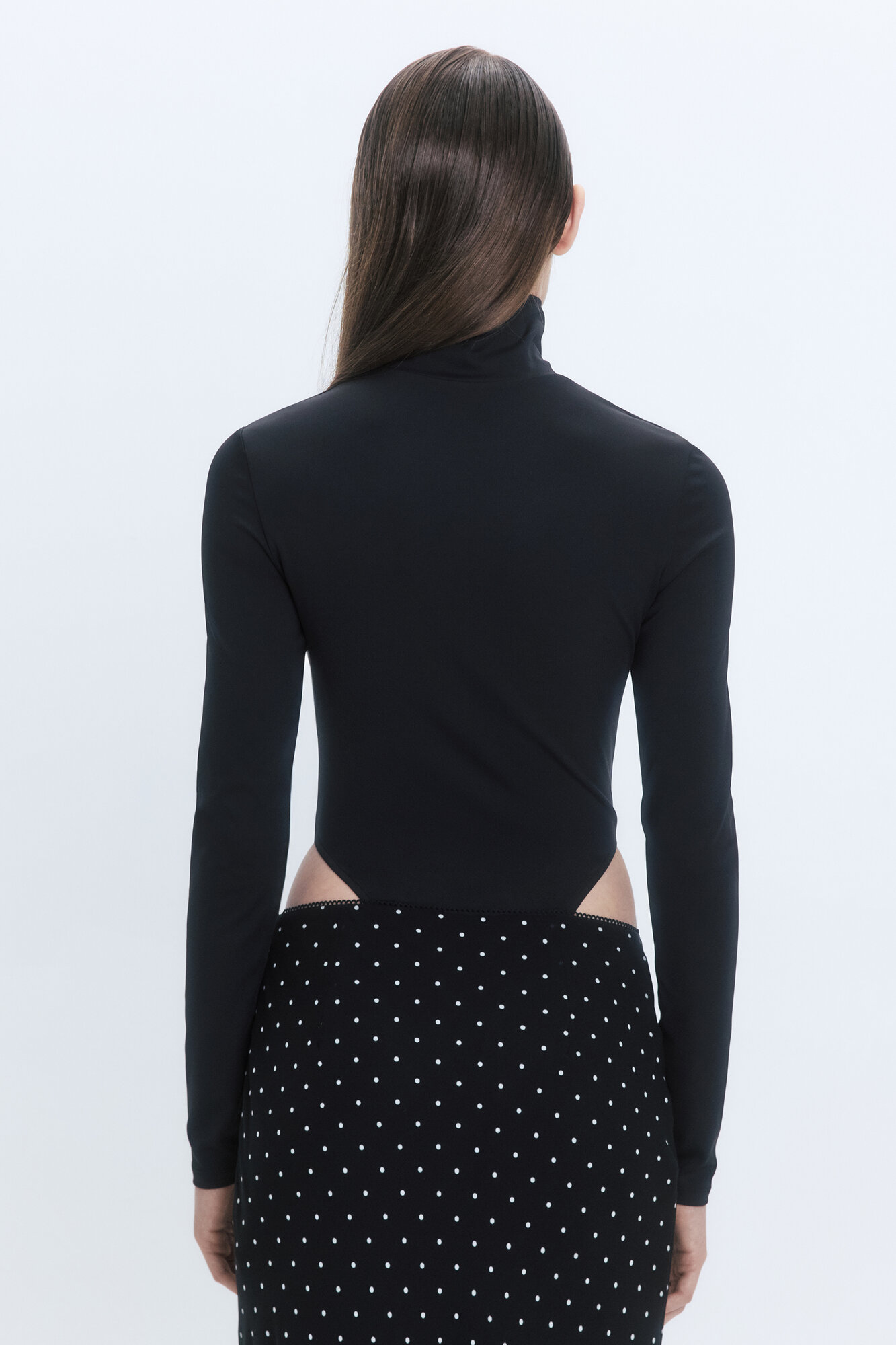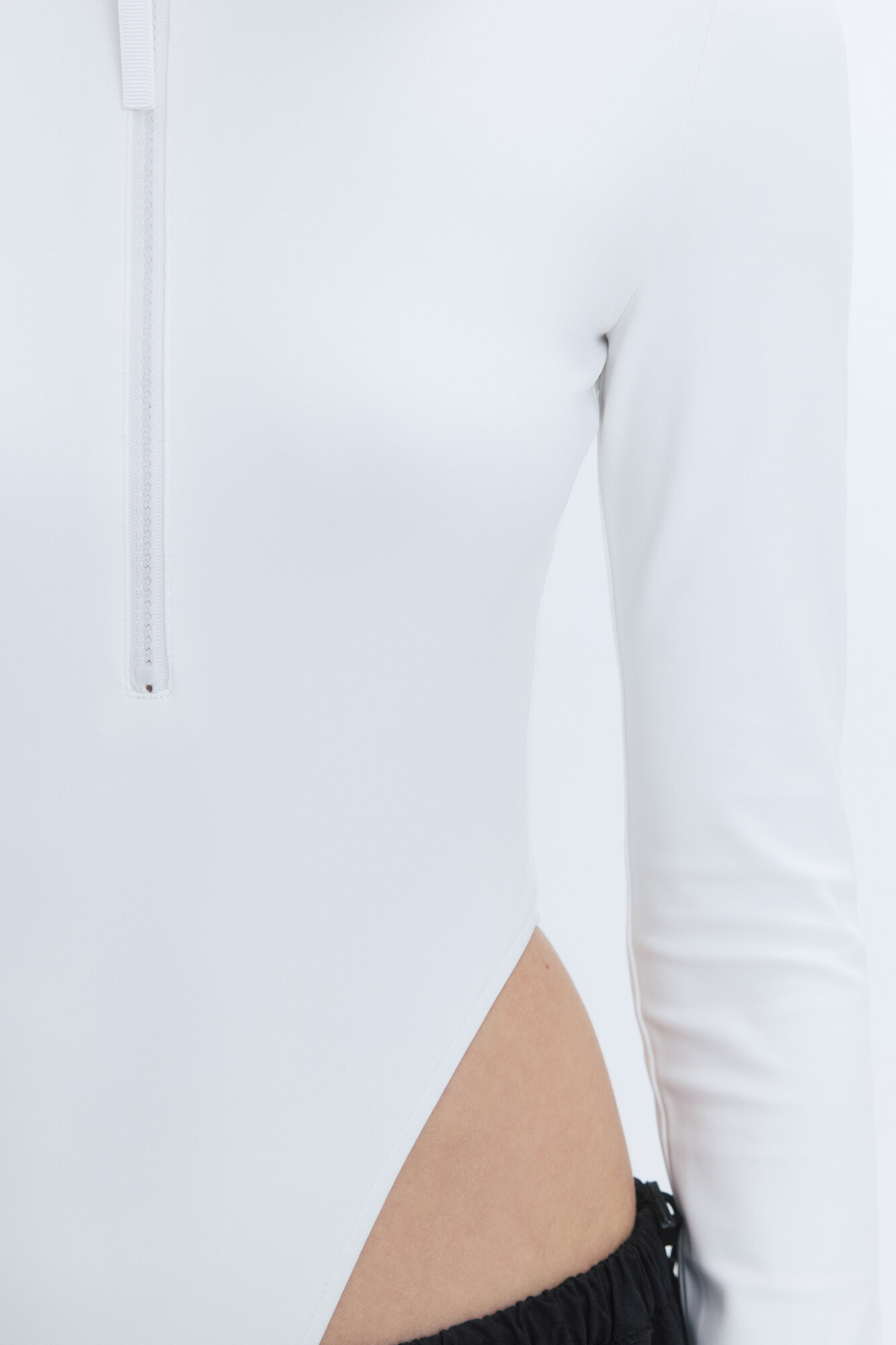 - Высокий воротник-стойка на молнии, который можно носить как отложной воротничок с V-образным вырезом. Длинные облегающие рукава с прямыми манжетами и прямой линией плеча. Высокие трусики-бразильяна с застежкой на кнопки снизу и боковыми вырезами