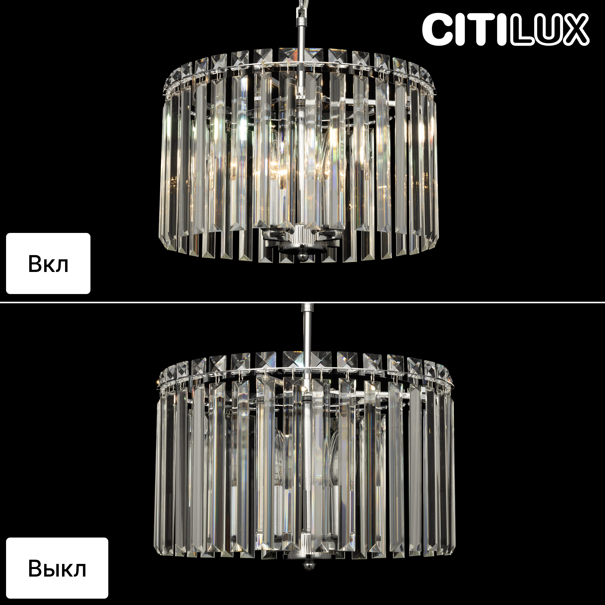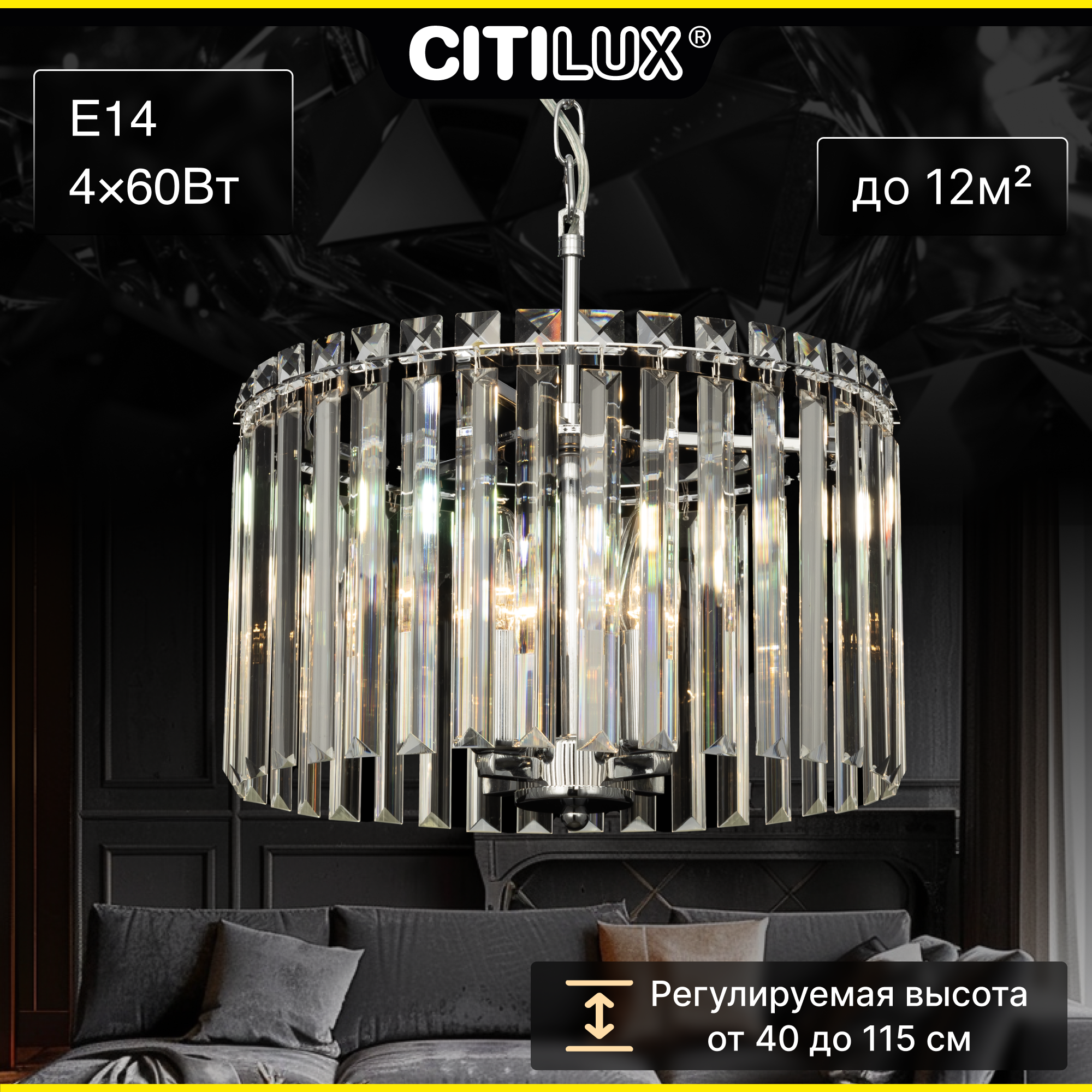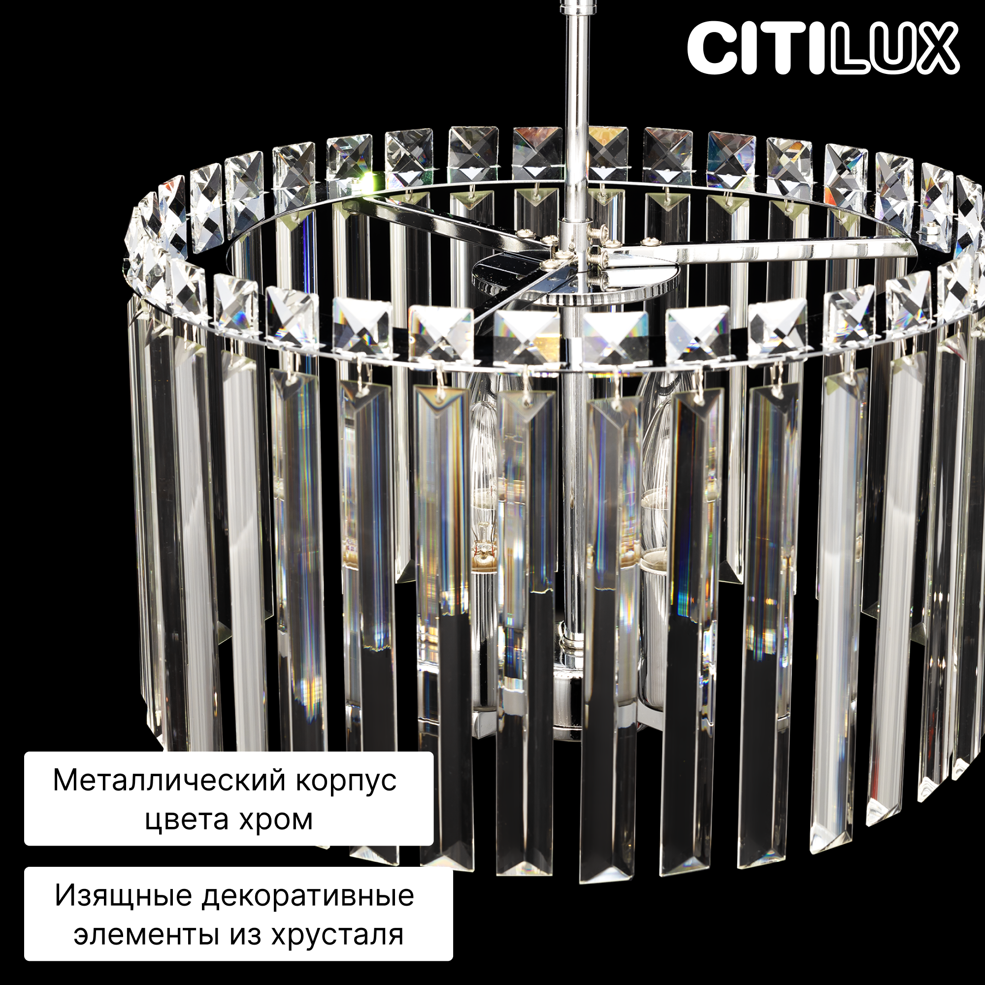 Подвесная хрустальная люстра Citilux Джейн выполнена в стиле современной классики. Корпус светильника металлический круглой формы, цвет глянцевый хром. Подвески хрустальные, кристально прозрачные с модной огранкой.В изделии 4 лампы с цоколем Е14 максимальной мощностью для ламп накаливания 60Вт (в комплект не входят, приобретаются отдельно). Люстра подходит для основного и дополнительного освещения помещений как с высокими, так и с низкими потолками, длина цепи регулируется при установке, тип крепления – планка.Изящная подвесная люстра Ситилюкс Джейн потрясающе выглядит в модных интерьерах стильных современных квартир, студий, апартаментов и уютных загородных домов. Ярко осветит гостеприимную кухню, аккуратную спальню, небольшую столовую и строгий кабинет. Поможет легко создать атмосферу изысканности в популярных кафе и ресторанах.